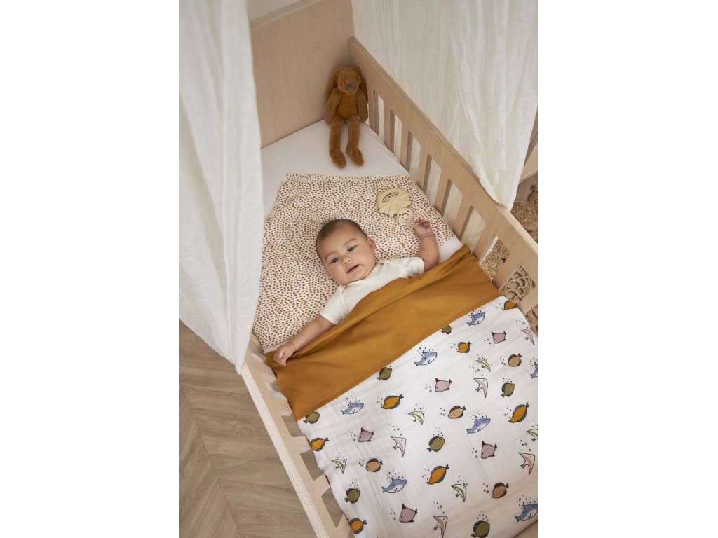 Dvouvrstvá a oboustranná mušelínová osuška. Je měkká, savá a příjemná na tělo. Lze použít jako lehkou přikrývku, osušku nebo deku na pláž.