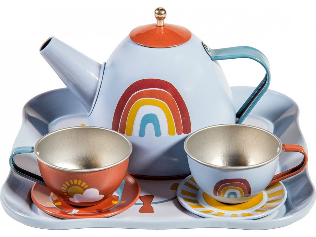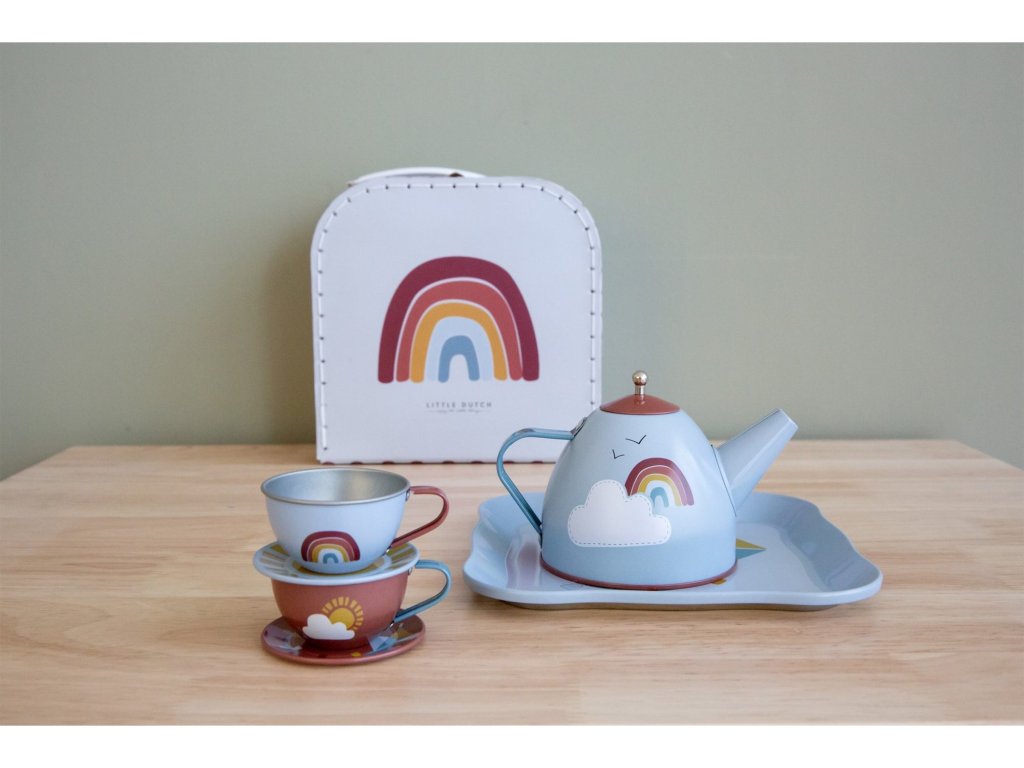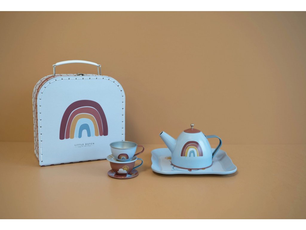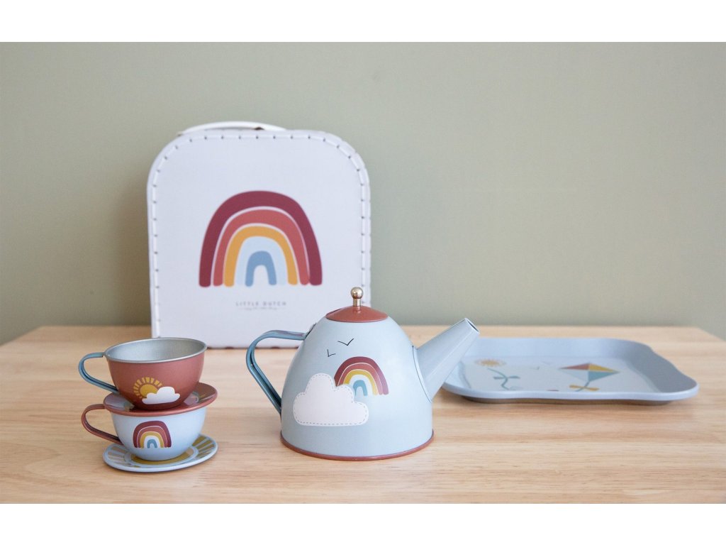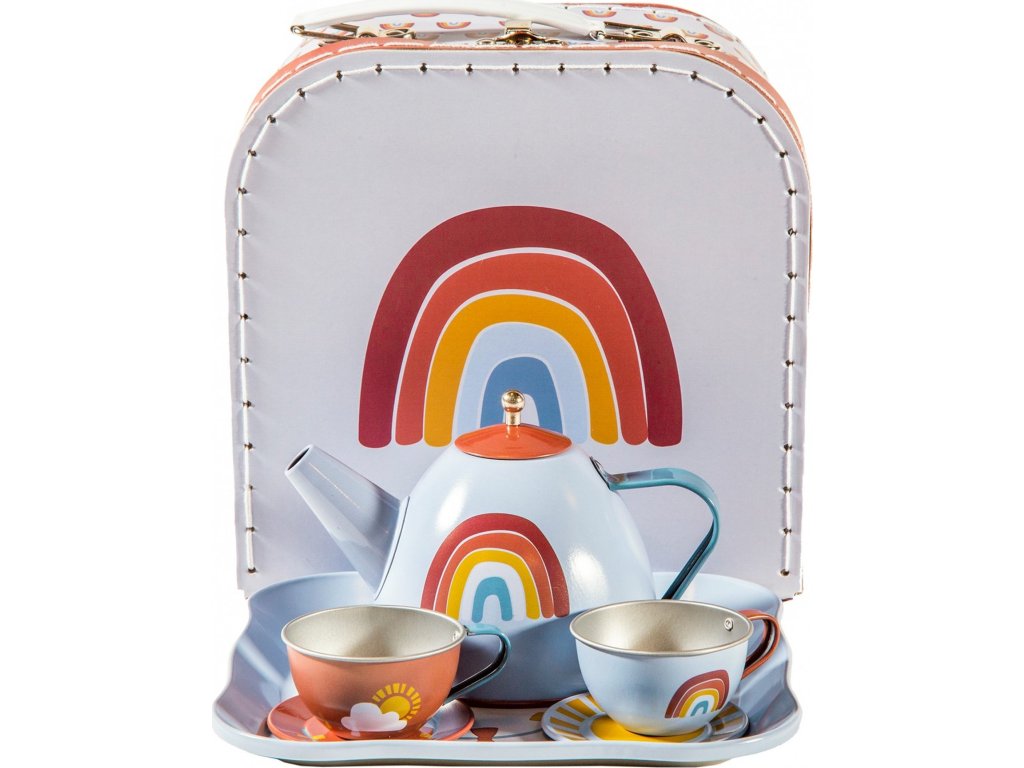 Sada se skládá z kufříku, dvou čajových šálků, dvou podšálků, tácu a konvice s víčkem v kovovém provedení s potiskem duhy.
