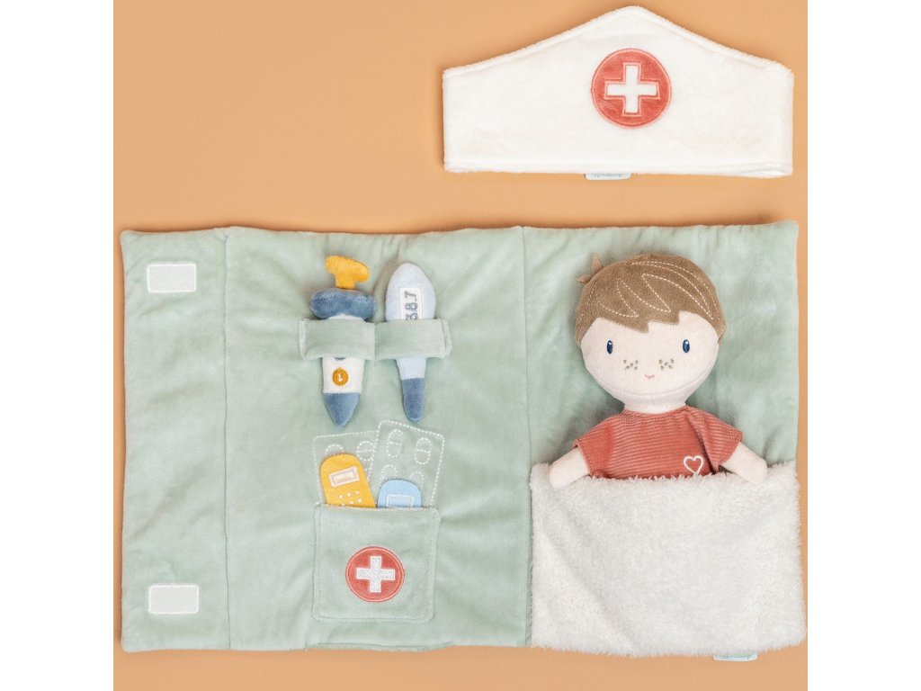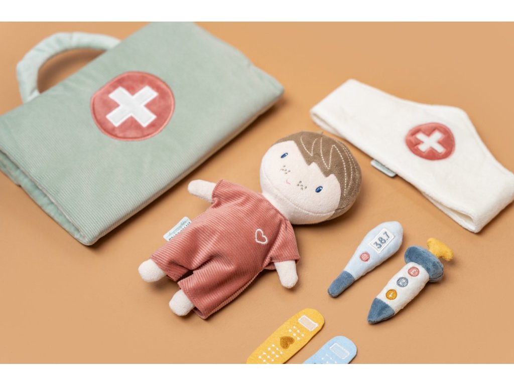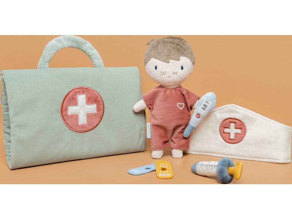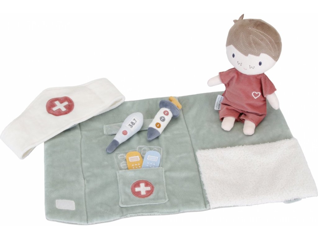 Originální sada s panenkou Jimem a lékařskými doplňky v krásném provedení z jemného plyšového materiálu. Jim se necítí dobře a bude potřebovat vyšetřit a uložit do postýlky. Váš malý lékař nebo lékařka si nasadí čepec a s pomocí teploměru zkontroluje Jimovi teplotu. Pokud bude potřeba zahájit léčbu, má k dispozci injekční stříkačku i náplasti.