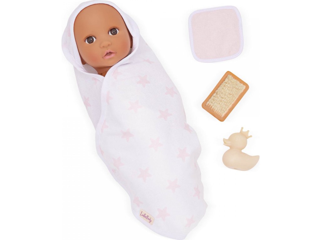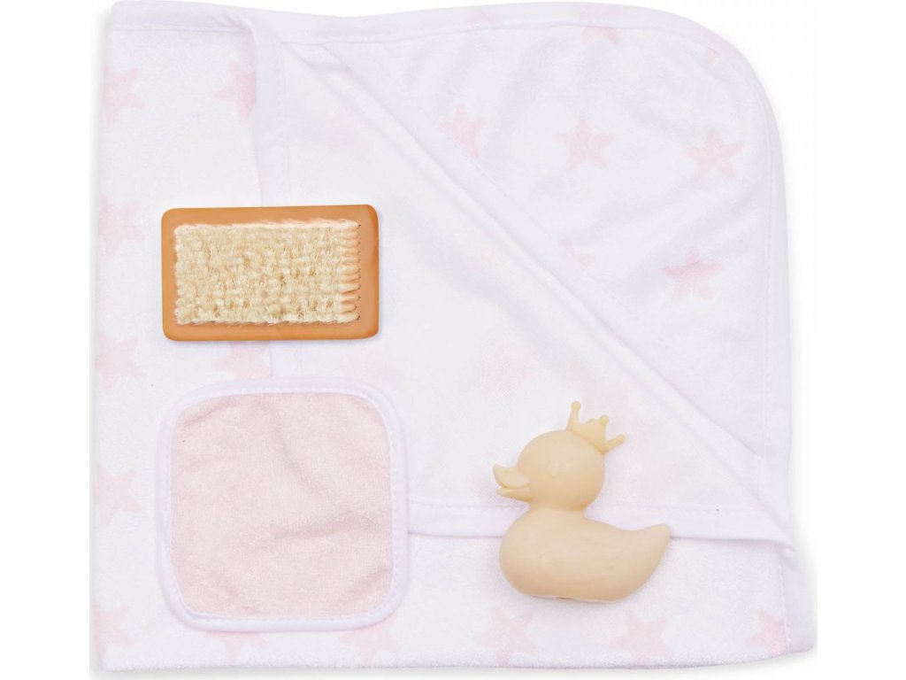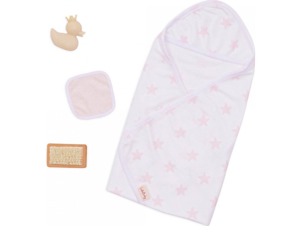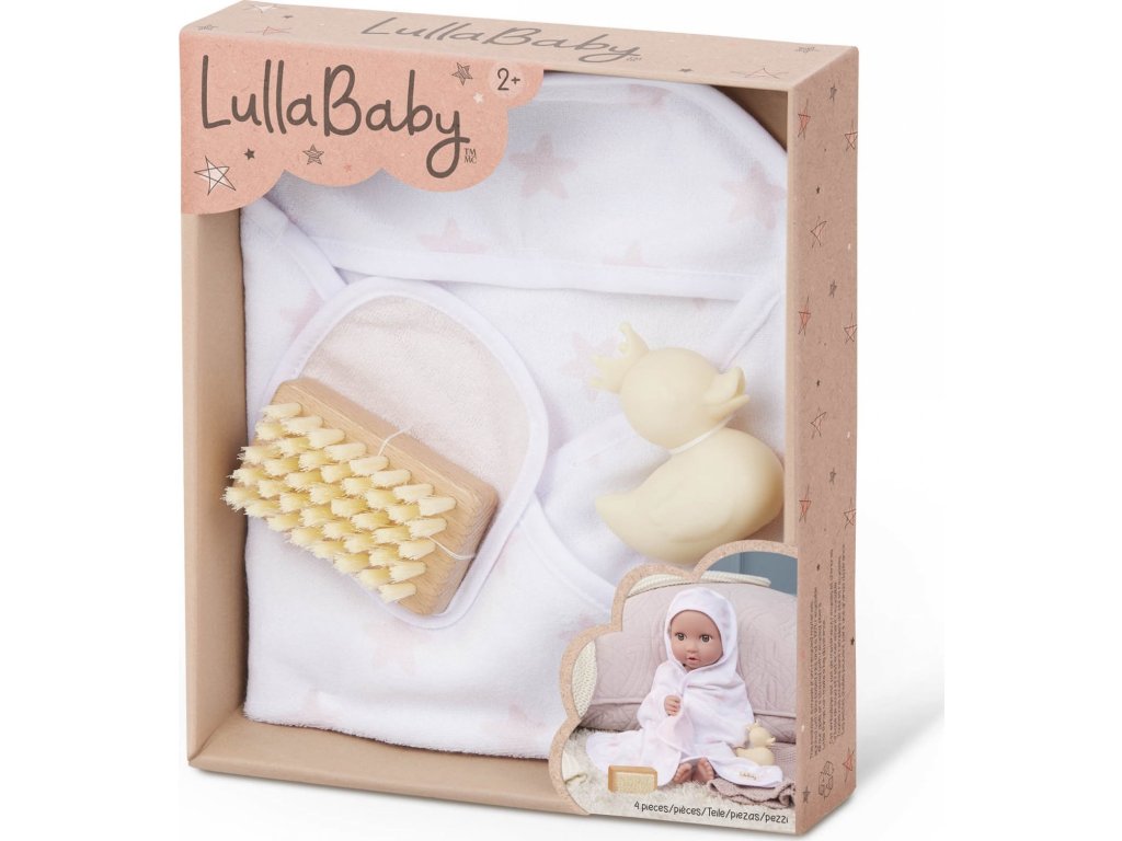 Sada osušky s doplňky LullaBaby obsahuje vše potřebné pro hraní na koupání – děti mohou panenku „umýt“ jemnou žínkou, kartáčem a samozřejmě si užít spoustu zábavy s malou gumovou kačenkou. Po koupeli je čas panenku osušit do měkké osušky s kapucí, která je zdobená růžovým potiskem s hvězdičkami. Celý set je ideální pro rozvíjení empatie, péče a fantazie při hře s panenkami.