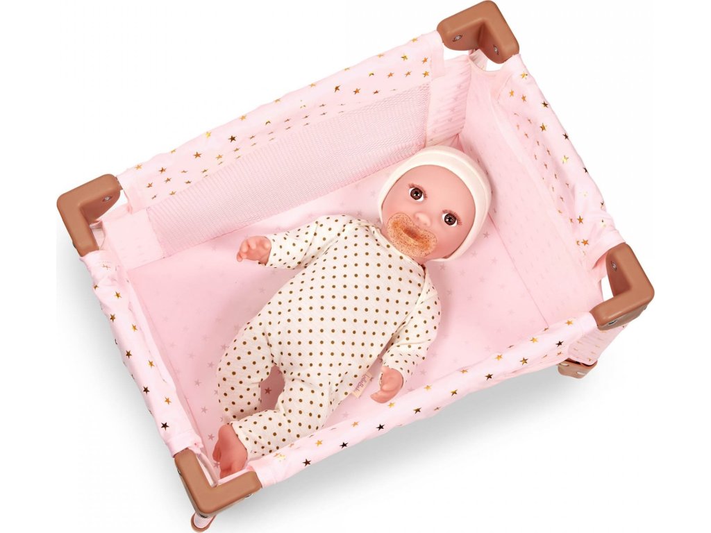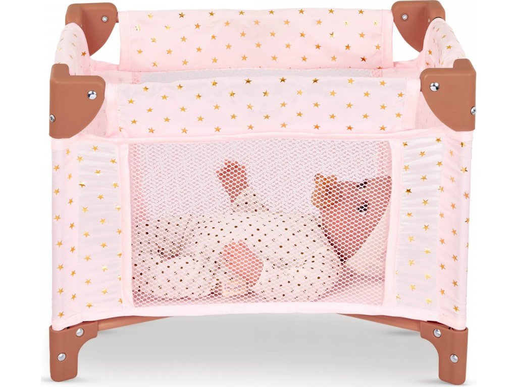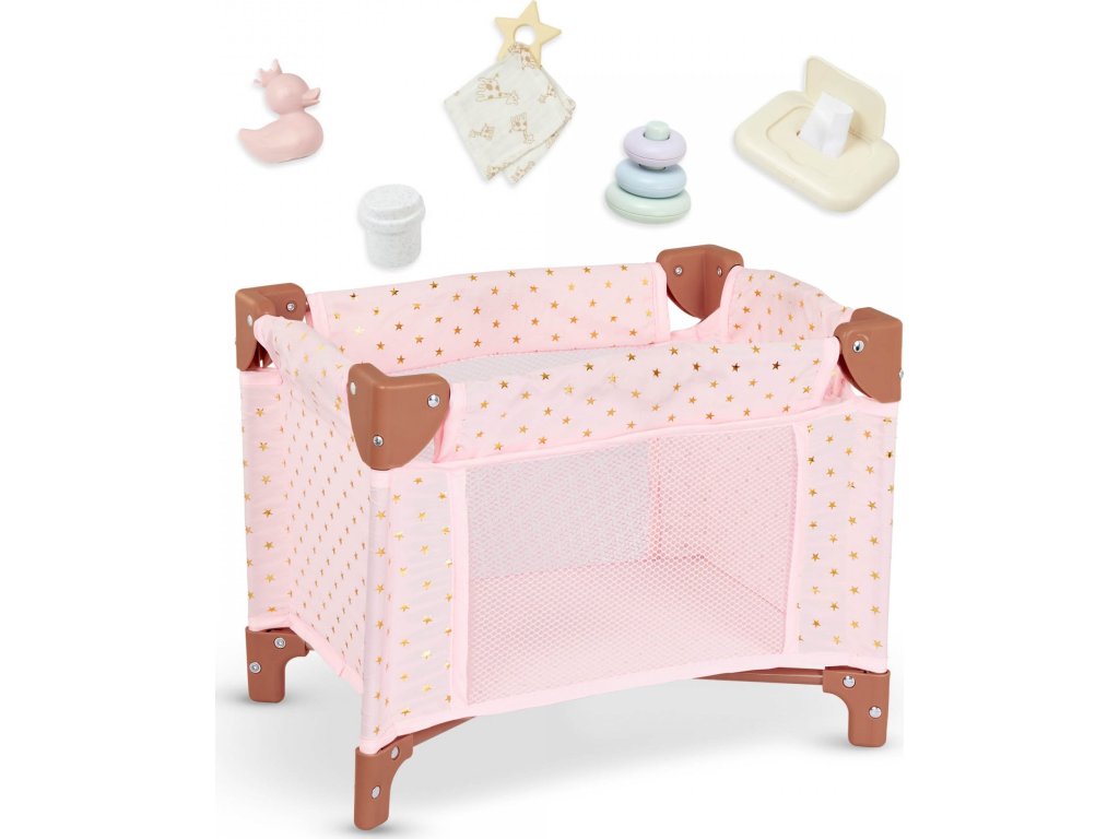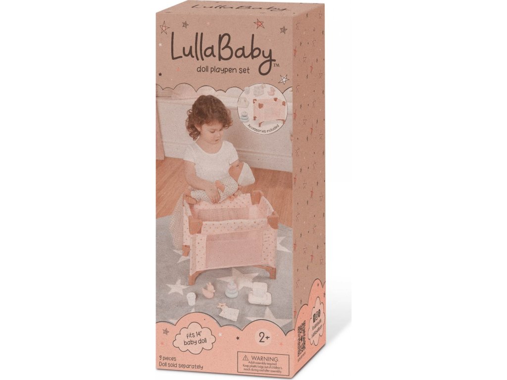 Dopřejte panence vašeho dítěte krásné místo ke snění i hraní s touto stylovou postýlkou LullaBaby. Jemné růžové provedení se zlatými hvězdičkami zapadne do každého dětského pokojíčku. Postýlka je stabilní a odolná pro každodenní hru, zároveň se ale snadno složí naplocho pro praktické uložení nebo cestování. Součástí balení je sada doplňků – kachnička do koupele, krabička s ubrousky, kousátko, hrneček a stohovací hračka.