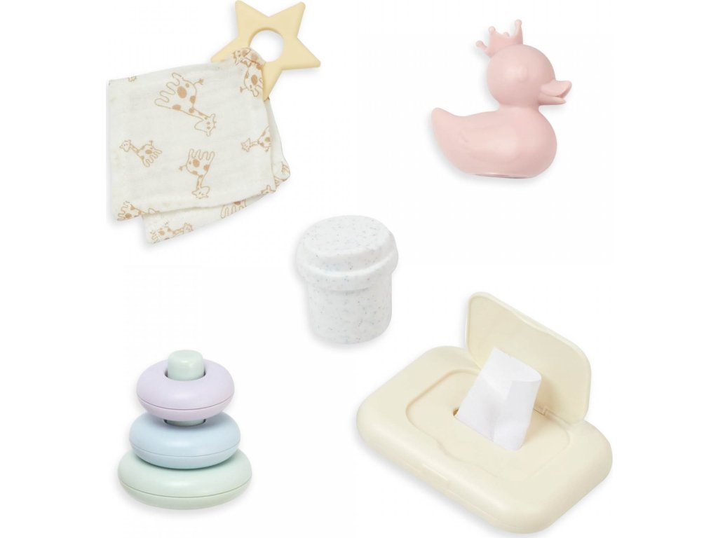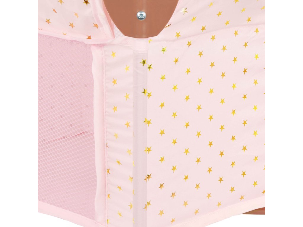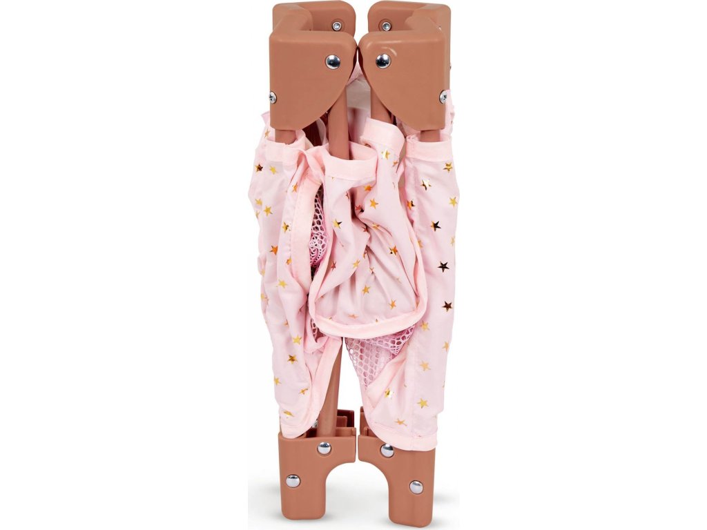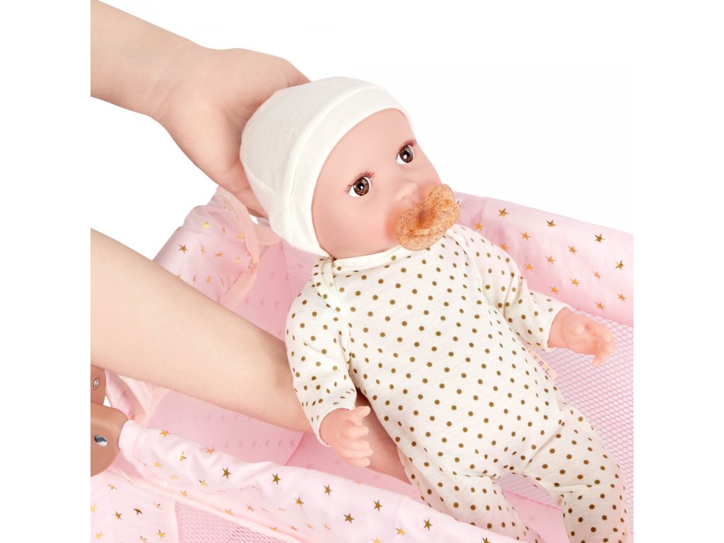 Dopřejte panence vašeho dítěte krásné místo ke snění i hraní s touto stylovou postýlkou LullaBaby. Jemné růžové provedení se zlatými hvězdičkami zapadne do každého dětského pokojíčku. Postýlka je stabilní a odolná pro každodenní hru, zároveň se ale snadno složí naplocho pro praktické uložení nebo cestování. Součástí balení je sada doplňků – kachnička do koupele, krabička s ubrousky, kousátko, hrneček a stohovací hračka.