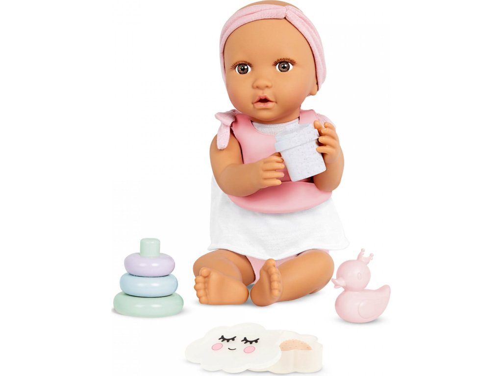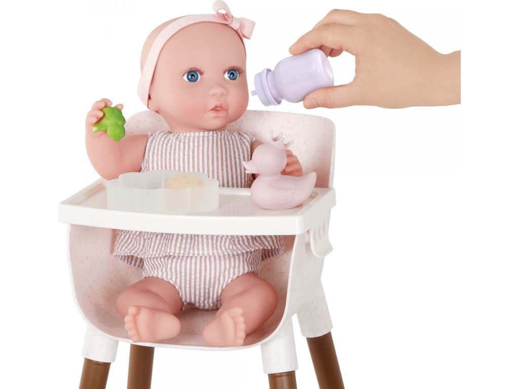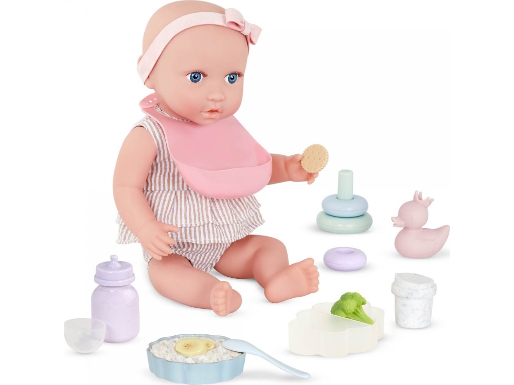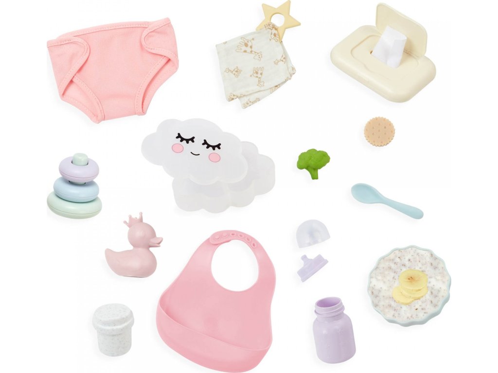 S touto sadou doplňků pro panenku se děti mohou postarat o nakrmení i přebalení své panenky jako opravdoví rodiče. Sada obsahuje bryndáček, misku s jídlem (ovesná kaše, brokolice a sušenka), lahvičku s mlékem, hrnek, lžičku, 2 kroužky, kousátko, kachničku, přebalovací plenku, zásobník ubrousků a praktický úložný box ve tvaru obláčku. Děti si mohou vyzkoušet péči o miminko, rozvíjet přitom jemnou motoriku, představivost i sociální dovednosti.