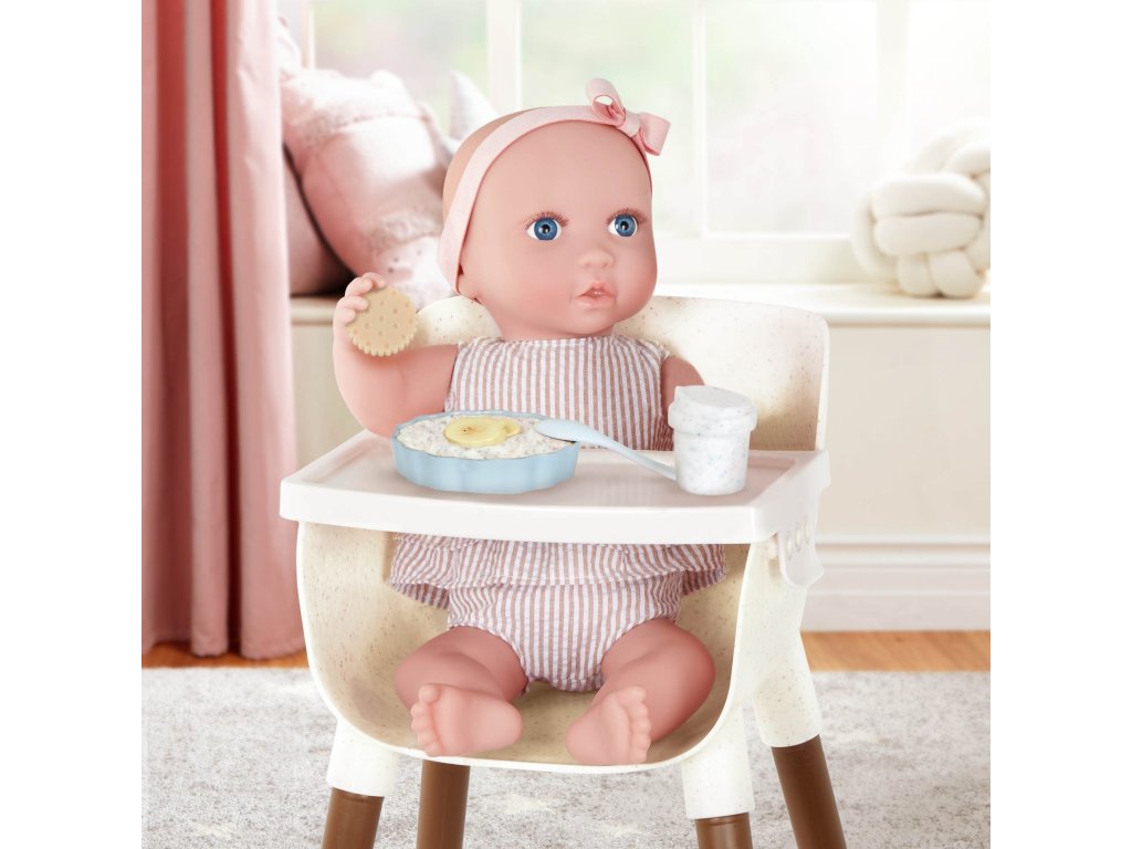 Stylová židlička s jídelním pultem umožní vašim dětem pohodlně usadit svou panenku a nakrmit ji pomocí bohaté sady doplňků, která obsahuje hrneček s odnímatelným víčkem, 2 sušenky, lžičku, misku ovesné kaše s banány, bryndáček a kousátko.