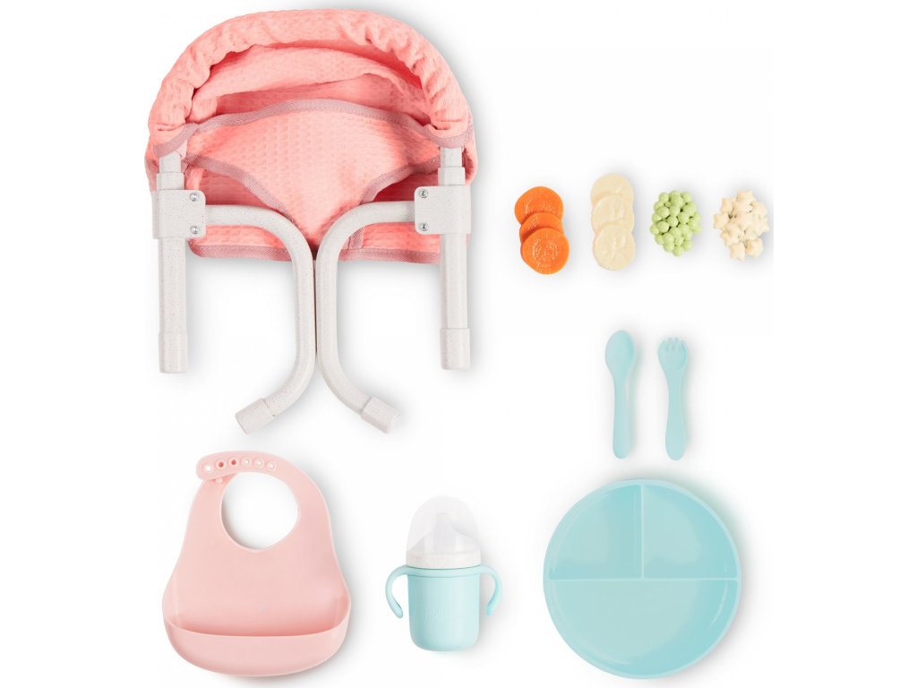 Sada obsahuje židličku, hrneček s odnímatelným víčkem, vidličku, lžíci, talíř, cereálie, hrášek, kolečka mrkve, kolečka banánů a bryndáček.