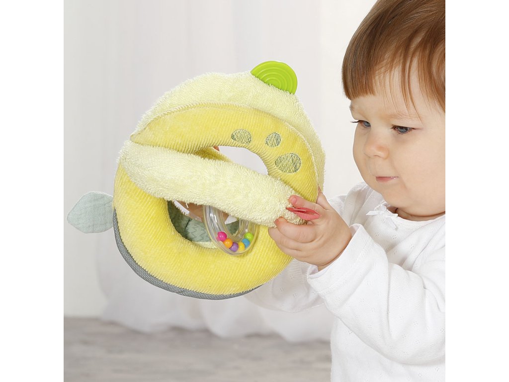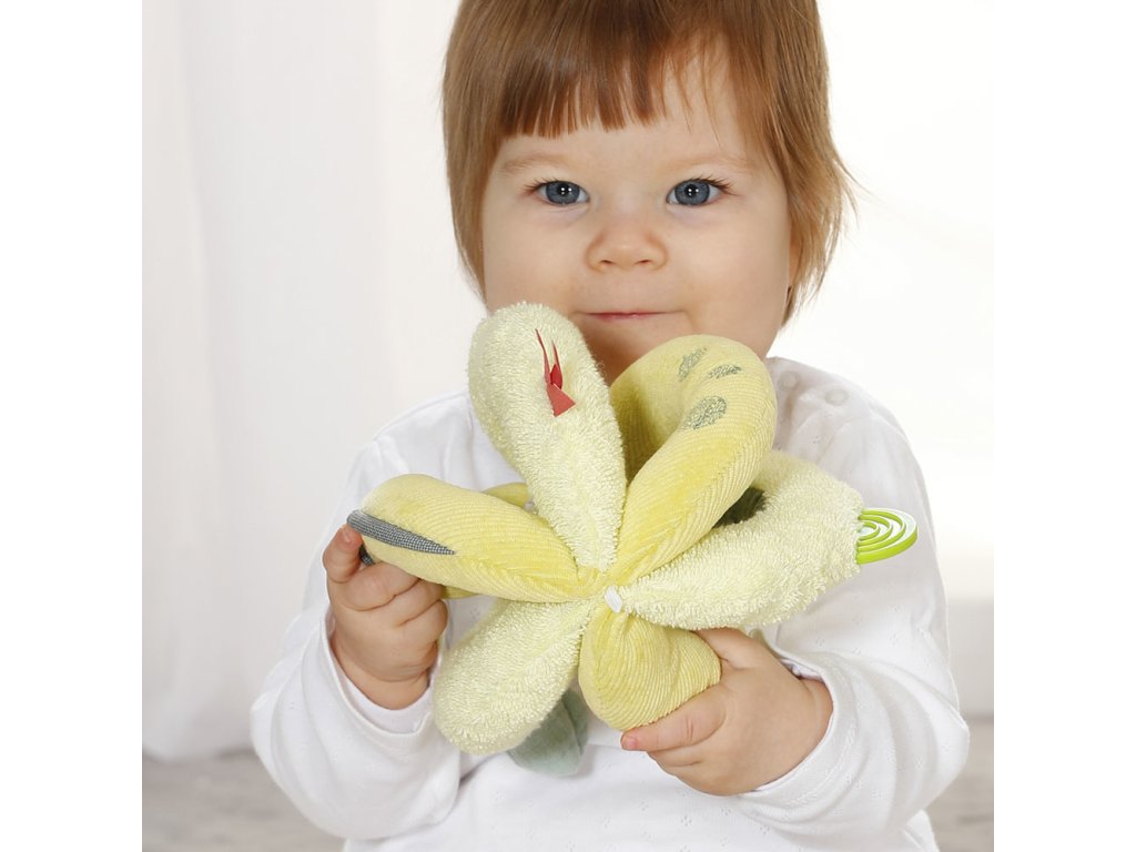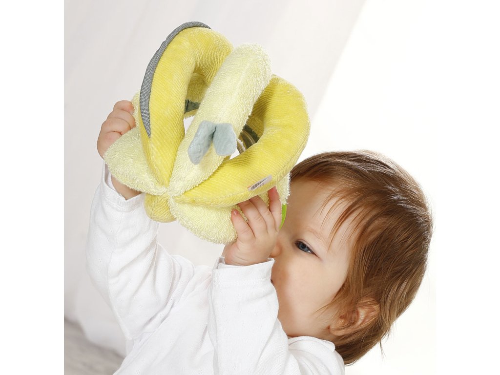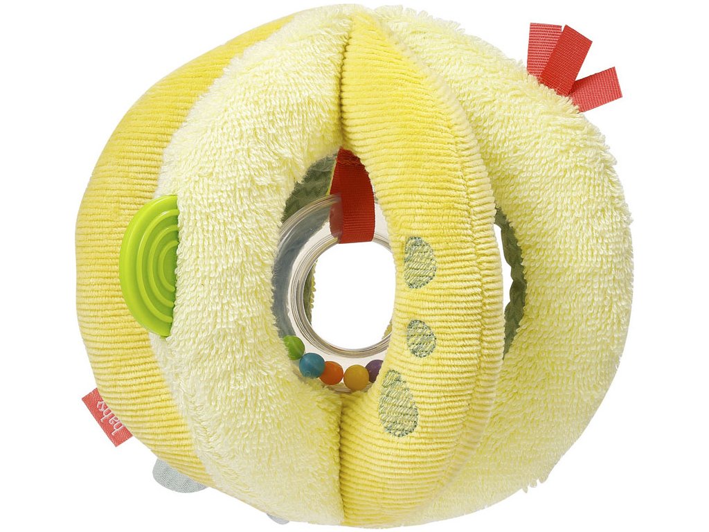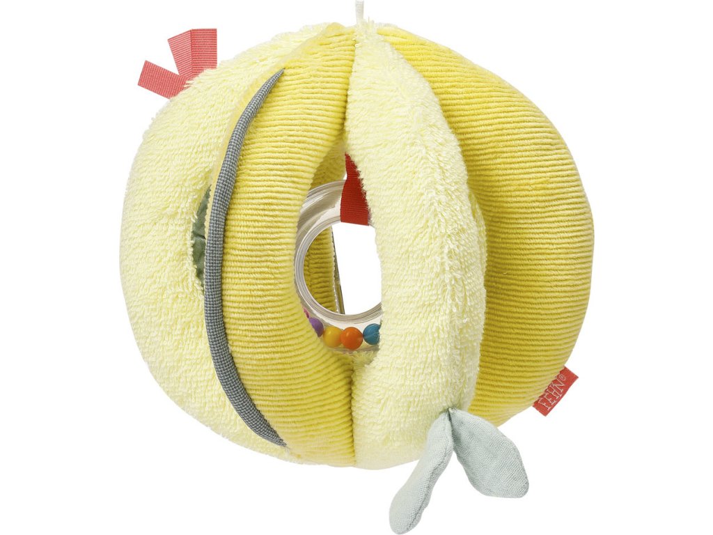 Měkký míč je vyroben z kvalitního manšestru a froté, vyplněn je plyšem. Podporuje přirozenou zvědavost dětí a přímo vybízí ke koulení, házení a hraní. Balónek je vybaven chrastítkem, šustícím papírem a pískátkem. Při hře podporuje zdravý vývoj motoriky, koordinace, smyslů a fantazie. Díky praktické velikosti je možné míč snadno přenášet a zmístí se do kočárku, autosedačky i dětské postýlky.