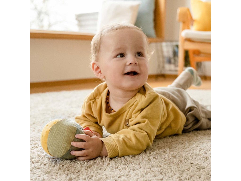 Děti si míček rychle oblíbí a chtějí ho mít všude s sebou díky jeho praktické velikosti – ať už doma, na cestách, v autosedačce nebo v kočárku.