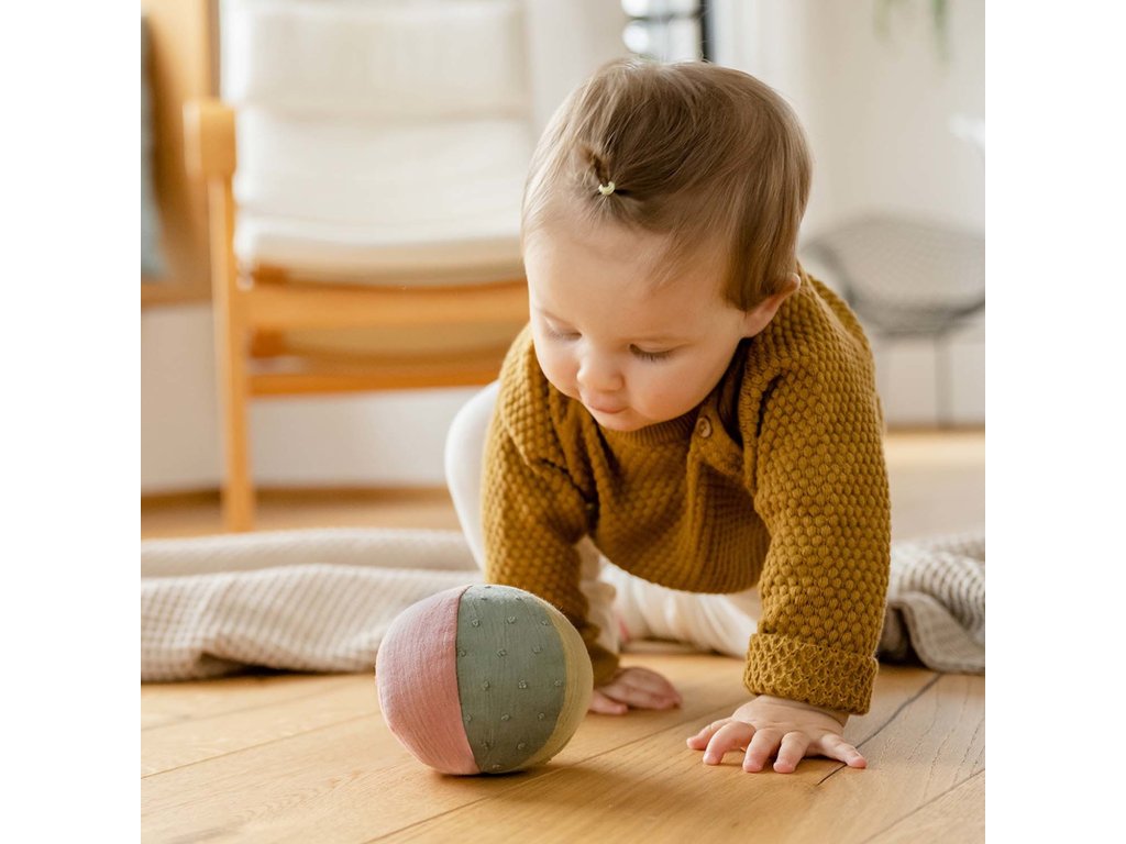 Lze snadno uchopit i do těch nejmenších ručiček, podporuje přirozenou zvědavost a hraní: kutálení, házení a jiné aktivity. Látkový míček s chrastítkem je věrným společníkem pro miminka již od narození. Látkový míček hravě podporuje dětskou zručnost, koordinaci ruka-oko a motorické dovednosti a vybízí ke zkoumání, uchopování a hře.