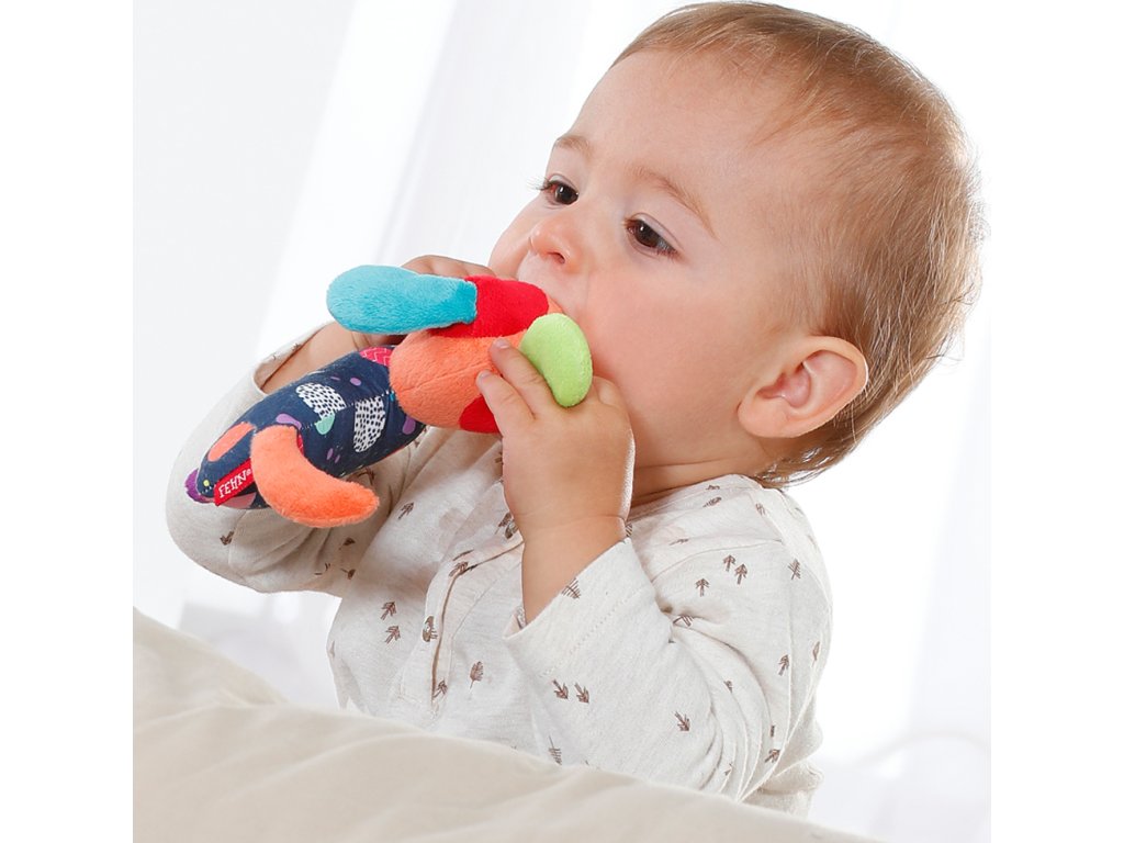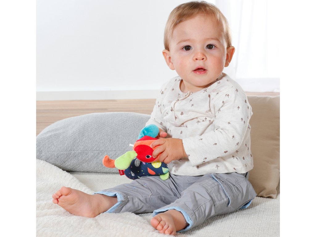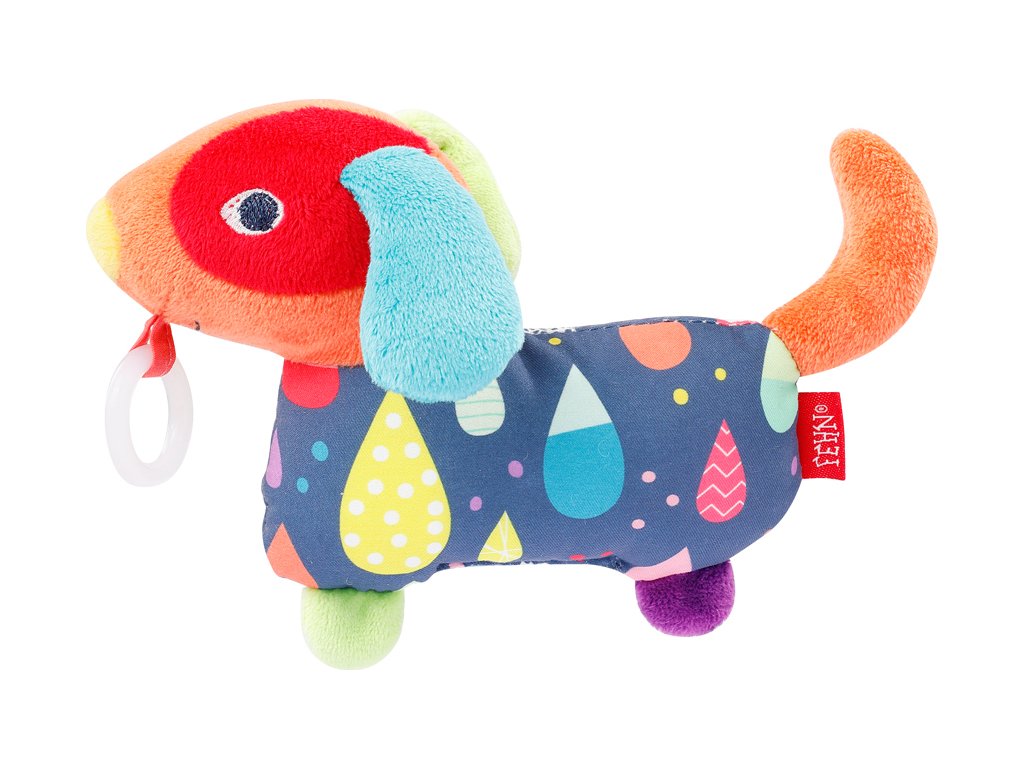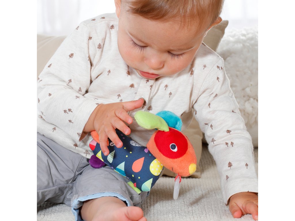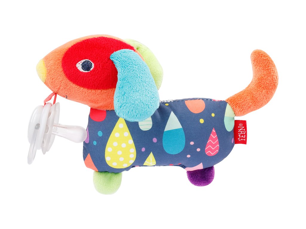 Roztomilý dudlík z kolekce COLOR Friends je to pravé pro malé průzkumníky světa. Všechny praktické dudlíky s rukojetí nebo bez ní lze připevnit na silikonový kroužek. Dudlíková hračka je tedy nejen krásná svými výraznými barvami a vzory, ale také super praktická. Skrytá chrastítka v plyšovém psíkovi podporují sluch dítěte, jeho uchopení a dotek, stejně jako jemnou motoriku. Barevný uchopovací pes je ideální jako dárek k narození, křtu nebo narozeninám.