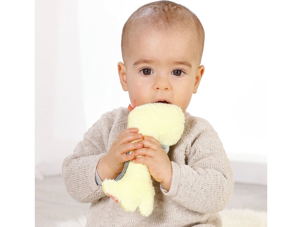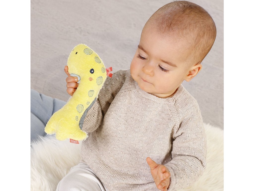 Měkký plyšový kamarád ve tvaru dinosaura potěší každé miminko. Podporuje přirozenou zvědavost a při zmáčknutí chrastí a píská. Měkký materiál je příjemný na dotek. Hračka podporuje vývoj sluchu, hmatu a jemné motoriky.