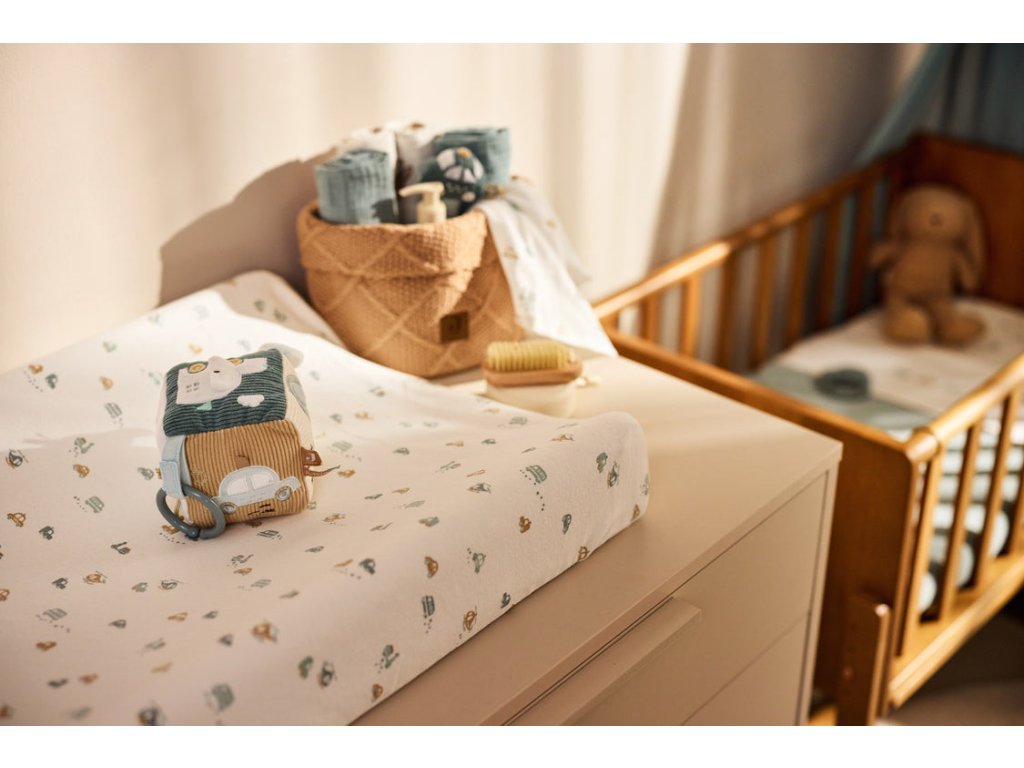 Žerzejový potah s krásným potiskem je určen pro potažení přebalovací podložky formátu 70 x 50 cm. Díky elastickému pásku na okrajích potah drží na podložce a neshrnuje se. Měkký bavlněný materiál potahu je pro dítě příjemný a zajistí, že ho přebalovací podložka nebude studit při doteku s pokožkou.