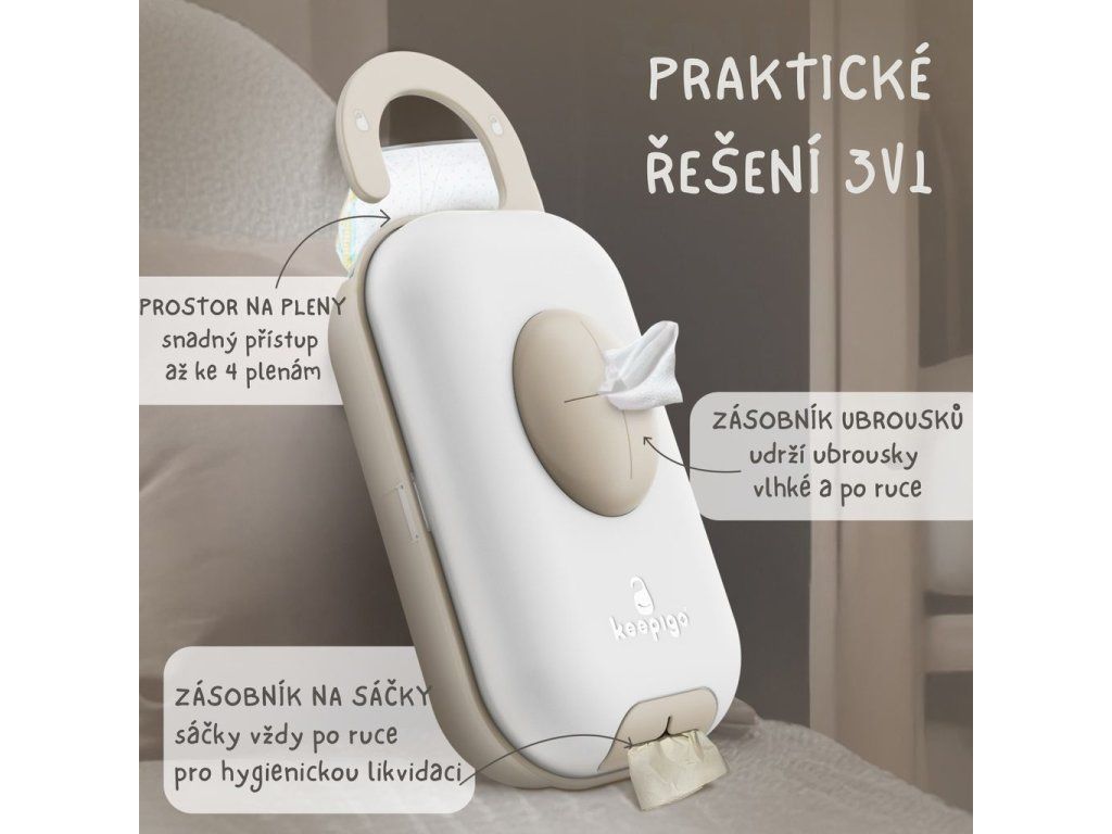 Minimalistický přebalovací organizér Keepigo je chytré 3v1 řešení pro každodenní přebalování miminek i batolat. Tento praktický organizér na pleny vám pomůže mít vše potřebné přehledně uspořádané a vždy po ruce – doma, u přebalovacího koutku, v autě i ke kočárku.