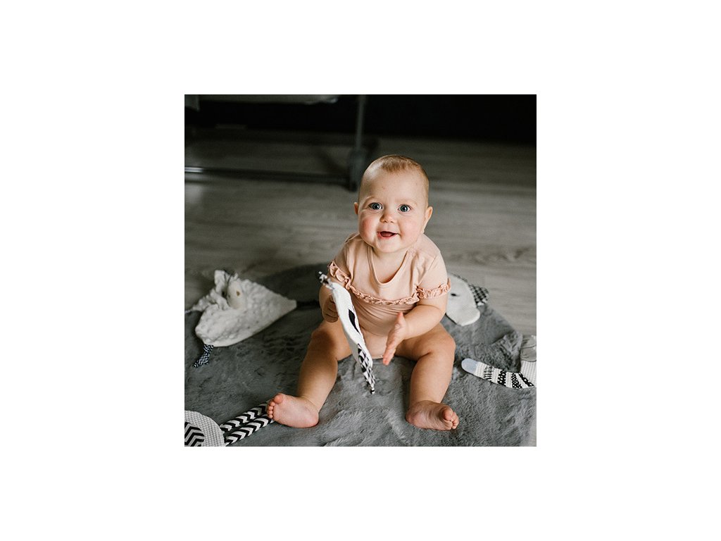 Černobílé šňůrky a uzlíky pomáhají miminku procvičovat si úchop. Vyčnívající vzorované detaily detaily jsou zajímavé pro nácvik manuální dovednosti.