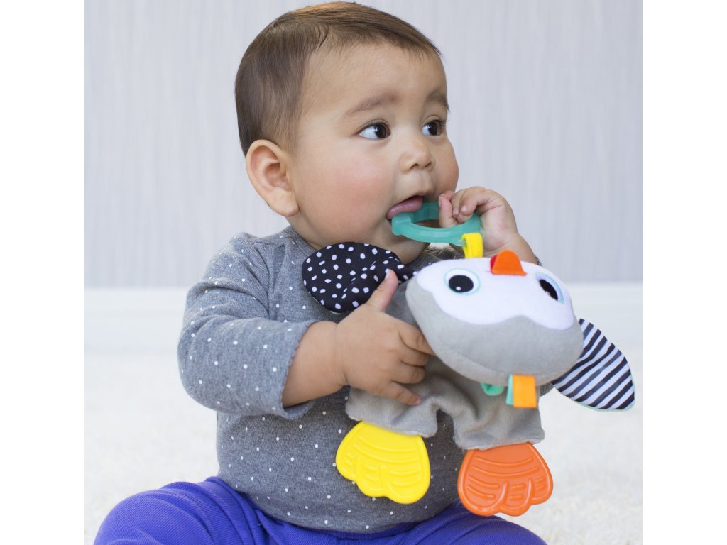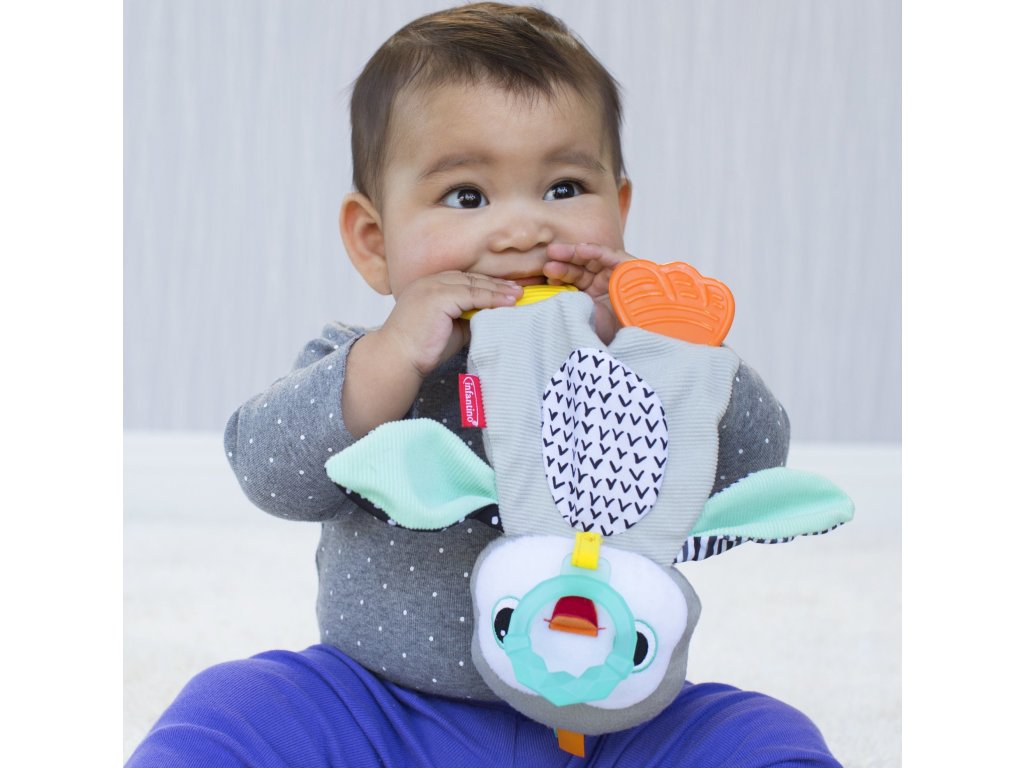 Mazlicí hračka s kousátky je vhodná jako první hračka dítěte. Různorodé textury i šusticí části lákají dítě ke zkoumání rukama i ústy. Kousátka dítěti uleví při prořezávání prvních zoubků.