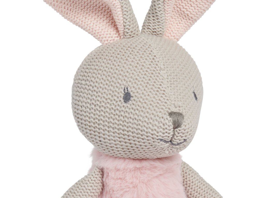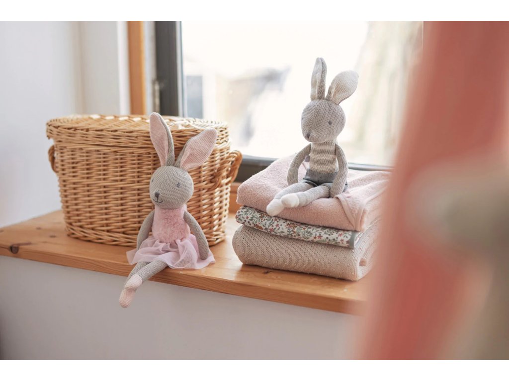 Roztomilá králičí holčička v růžových šatičkách je díky svému provedení z jemné bavlněné pleteniny ideální jako mazlík do postýlky pro klidné usínání. Může se stát součástí mnoha dětských her i sloužit jako krásná dekorace v dětském pokoji.