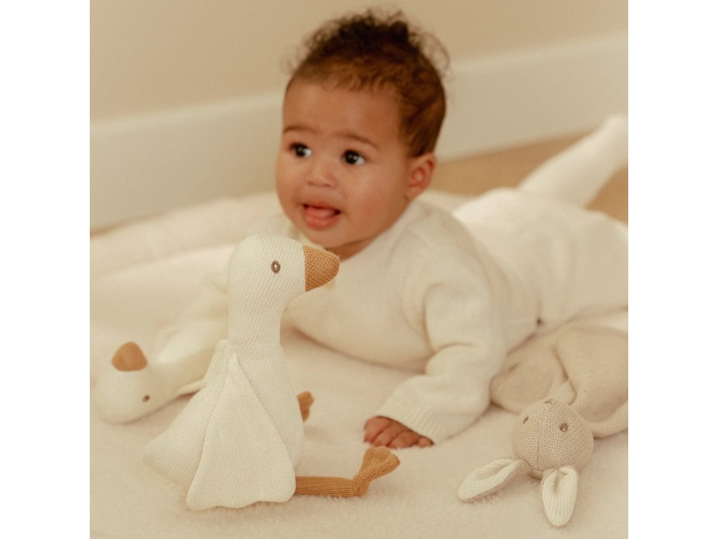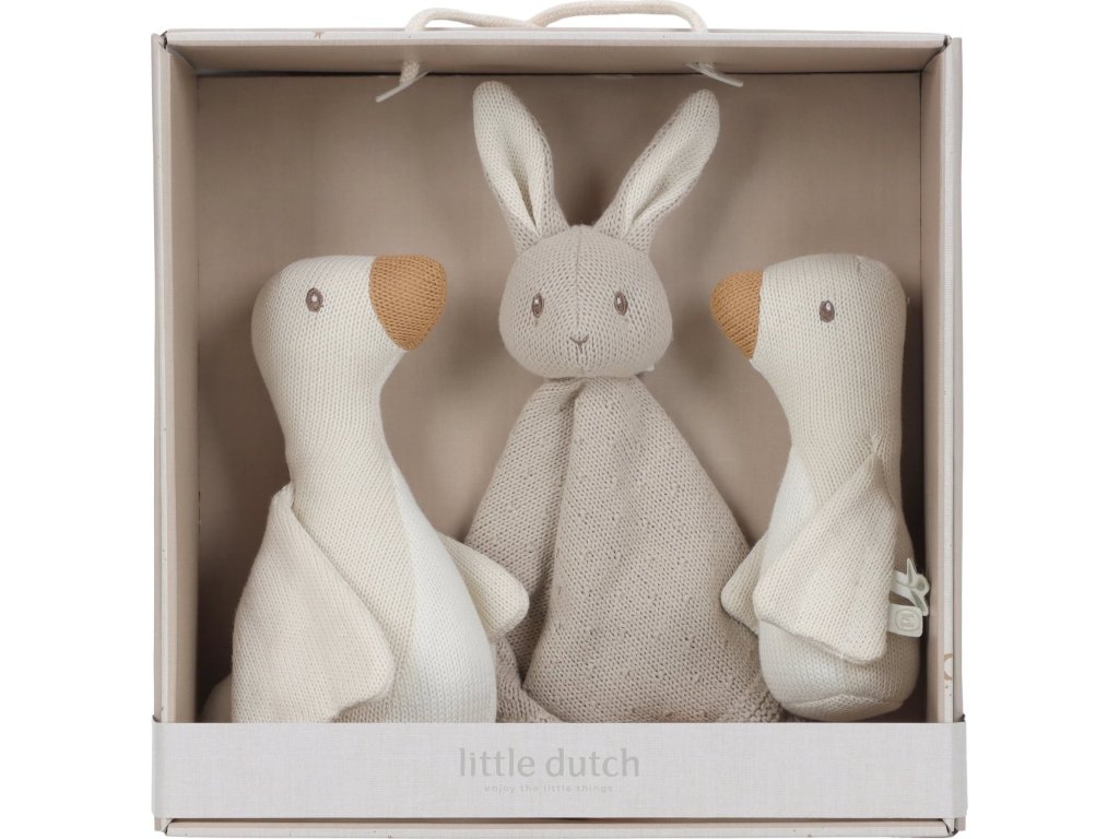 Krásná dárková sada hraček z jemné pleteniny je ideální jako dárek pro novorozené miminko. Sada obsahuje muchláčka s králíčkem a dvě hračky v podobě husy.