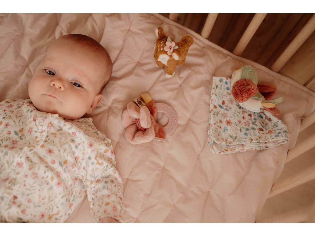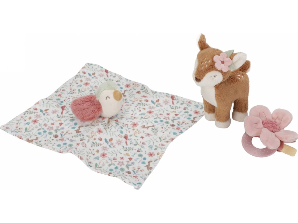 Krásná dárková sada plyšových hraček je ideální jako dárek pro novorozené miminko. Sada obsahuje kousátko s kytičkou, muchláčka s ptáčkem a plyšovou srnku.