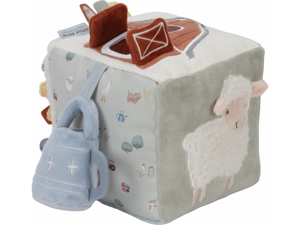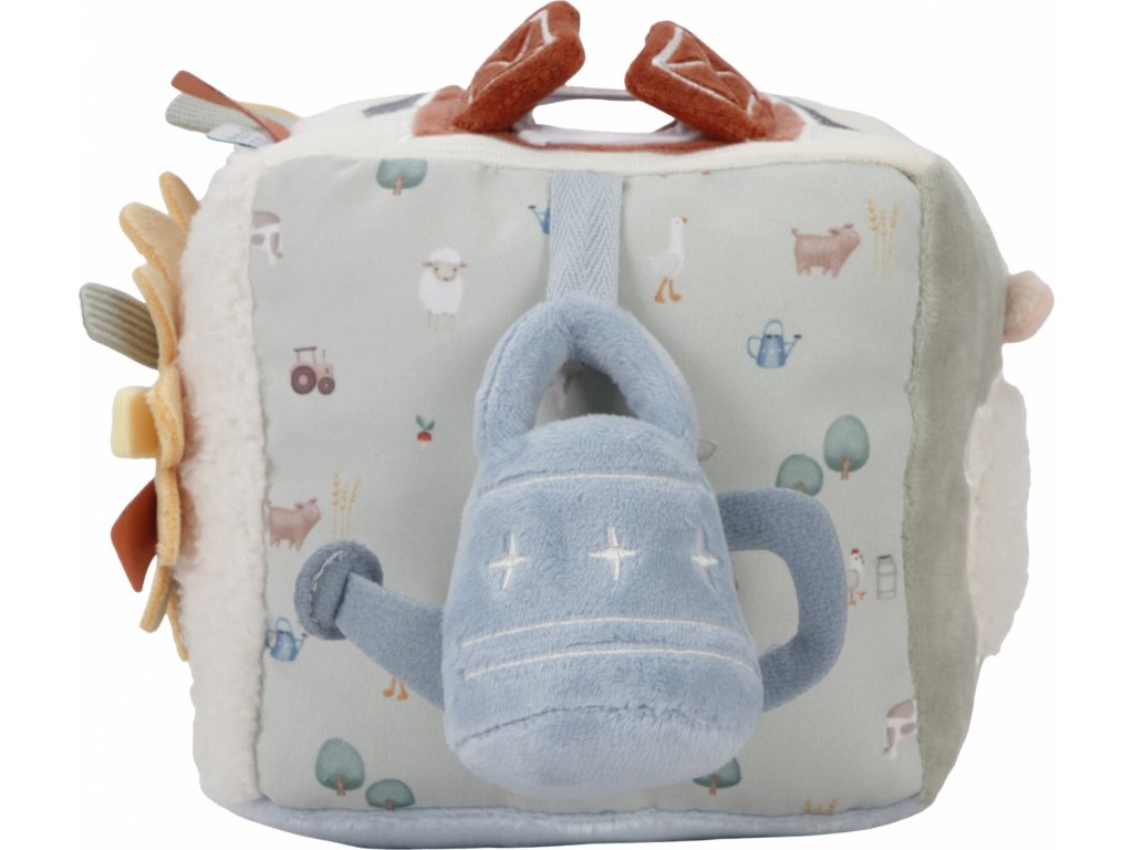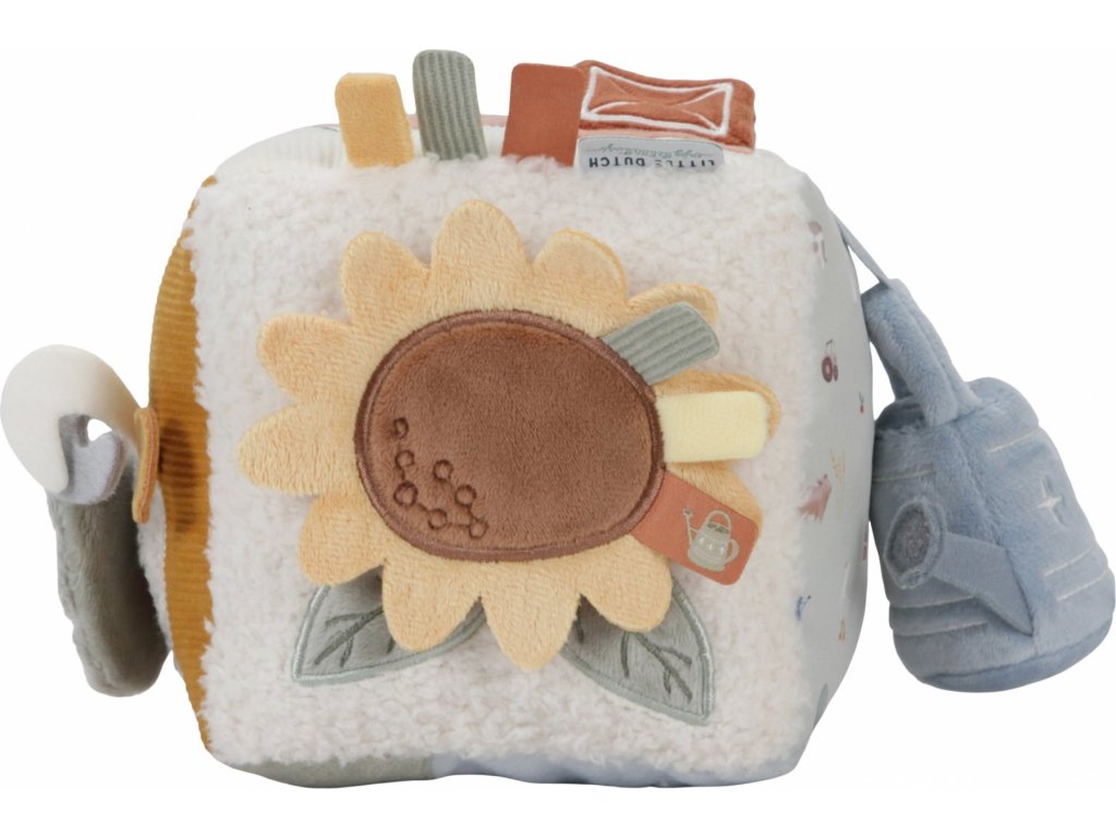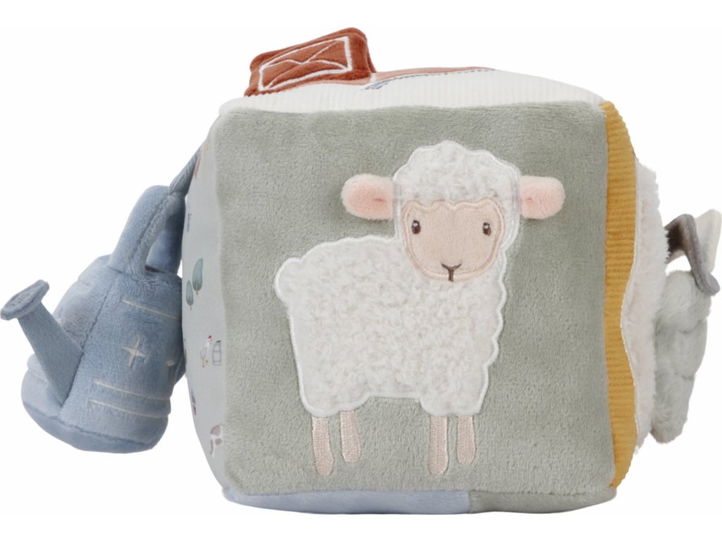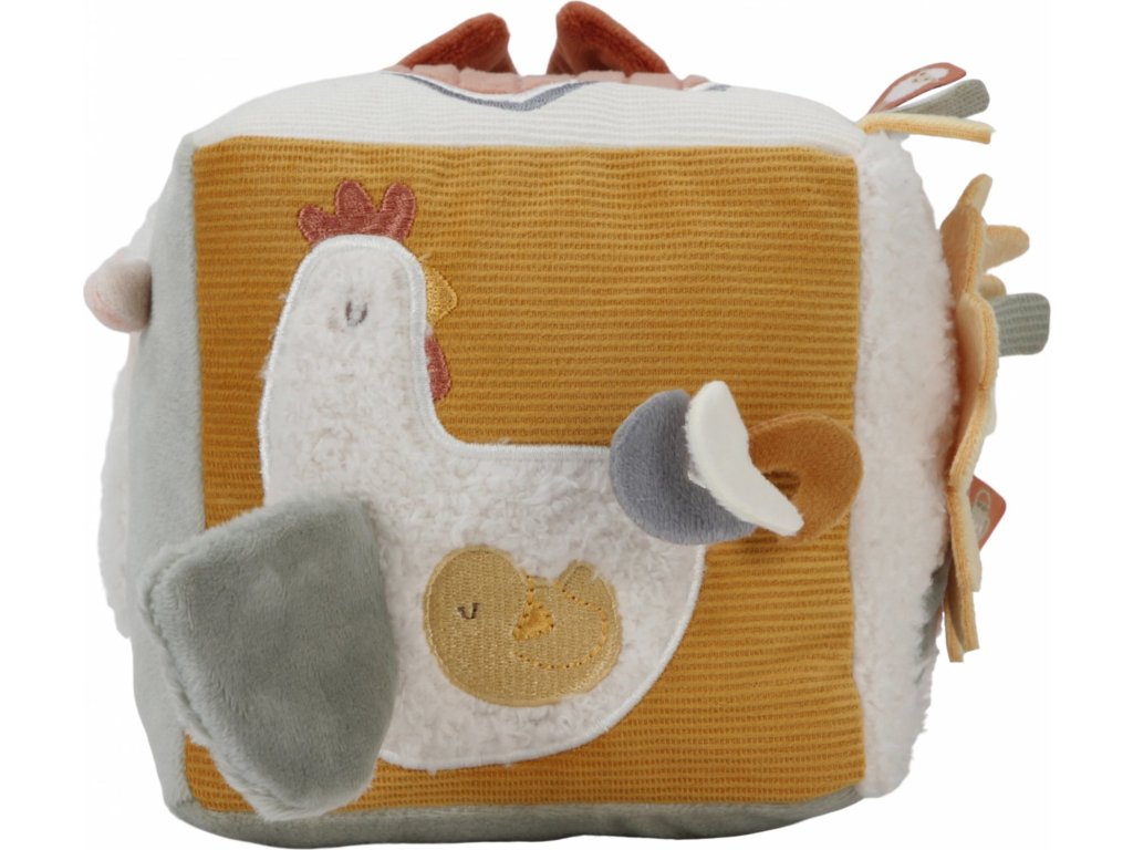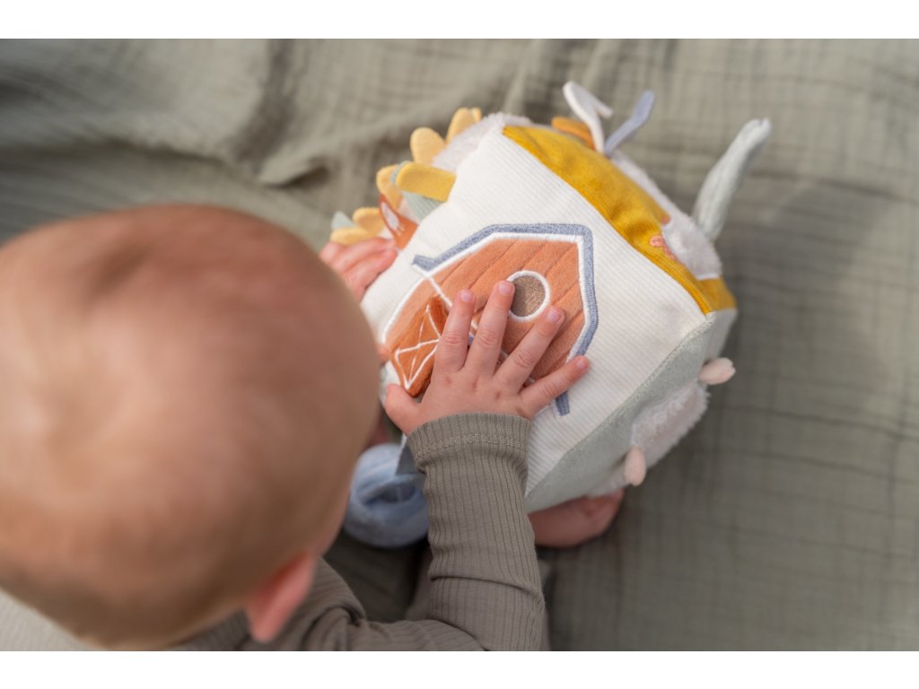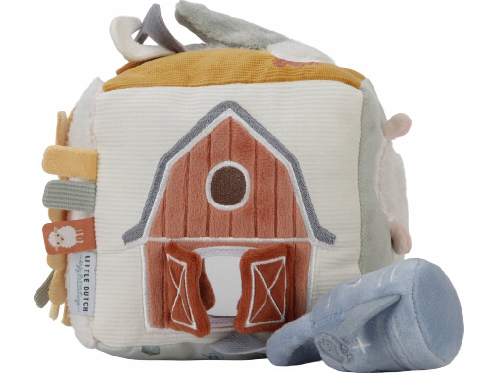 Měkká plyšová kostka je díky svému provedení snadno uchopitelná malými dětskými ručičkami. Různorodé textury, připevněné hračky a vyšívané ilustrace motivů ze života na farmě lákají dítě ke zkoumání, kostka navíc při pohybu jemně cinká.