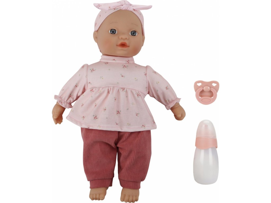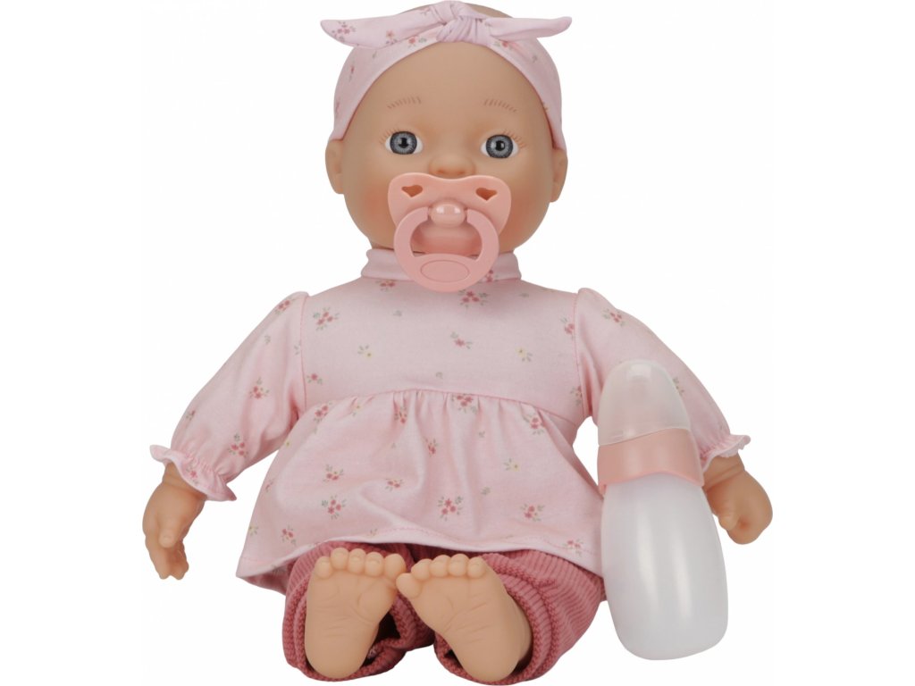 Roztomilou panenku v podobě miminka může vaše holčička i chlapeček převlékat, chovat, krmit lahvičkou, uklidňovat dudlíkem i vozit v kočárku. Panenka je oblečena do něžných růžových šatiček, žebrovaných kalhot a čelenky, součástí balení je i lahvička a dudlík.
