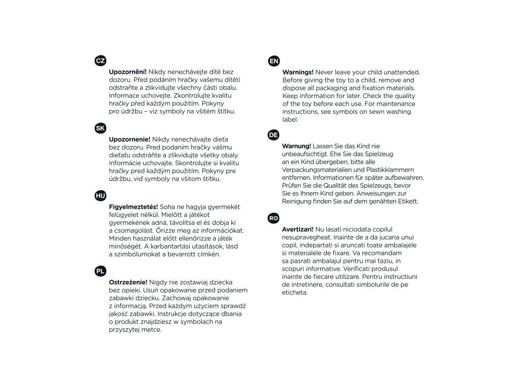 UPOZORNĚNÍ! Nikdy nenechávejte dítě bez dozoru. Před podáním hračky vašemu dítěti odstraňte a zlikvidujte všechny obaly. Informace uchovejte. Zkontrolujte si kvalitu hračky před každým použitím. Pokyny pro údržbu, viz symboly na všitém štítku. Před použitím se doporučuje vyprat.