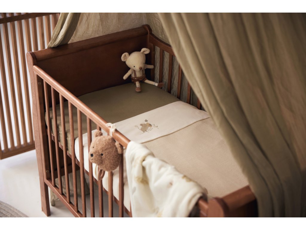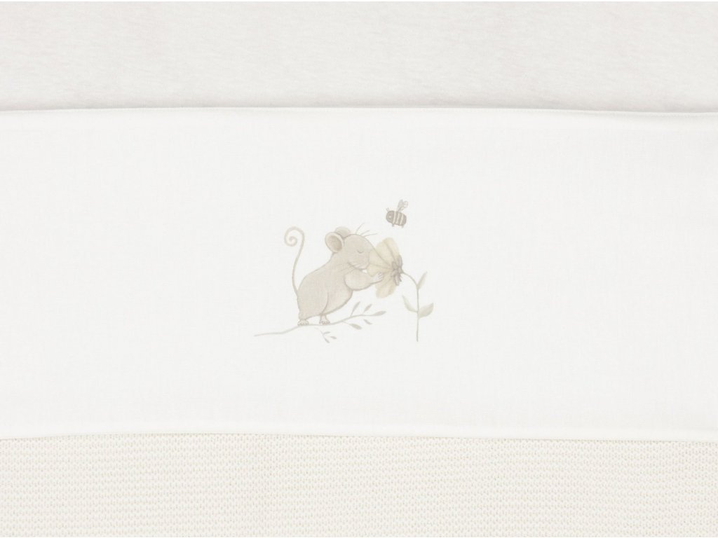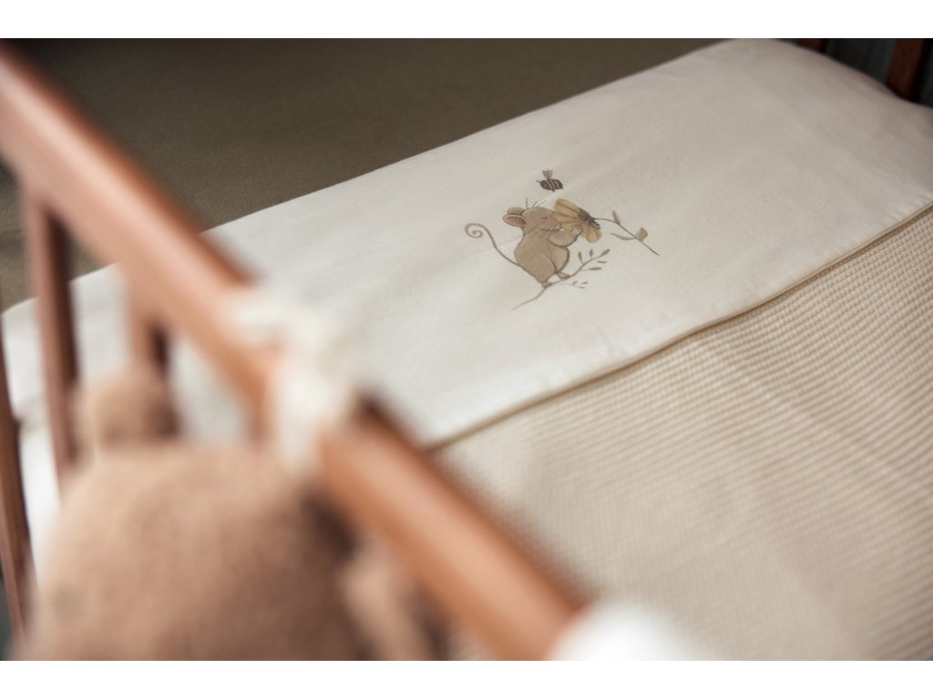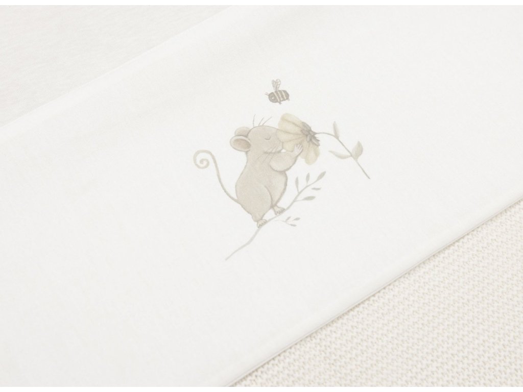 Prostěradlo z měkké, jemné 100% bavlny s motivem roztomilé myšky je ideální jako doplněk k pletené či fleecové dece, kterou přikrýváte miminko v košíku či postýlce. Chrání deku před znečištěním podobně jako klasické povlečení.