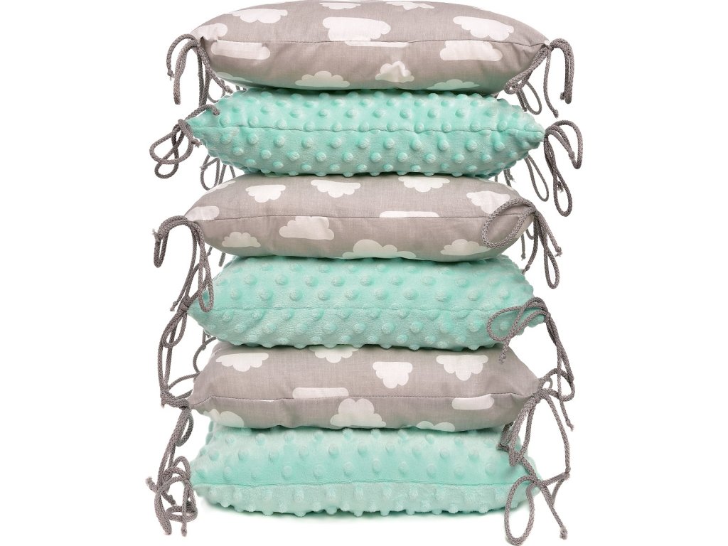 Polštářkový mantinel T-TOMI tvořený 6 kusy jednotlivých polštářků o velikosti 35 x 35 cm vyrobený ze 100% bavlny a z jemného, hřejivého a luxusního materiálu MINKY (3+3). Polštářky T-TOMI lze uvázat po boční straně postýlky a poskytnou tak Vašemu děťátku ochranu, pohodlí a bezpečí zároveň. Miminko se bude cítit v postýlce příjemněji než ve volném otevřeném prostoru, bude klidněji usínat.