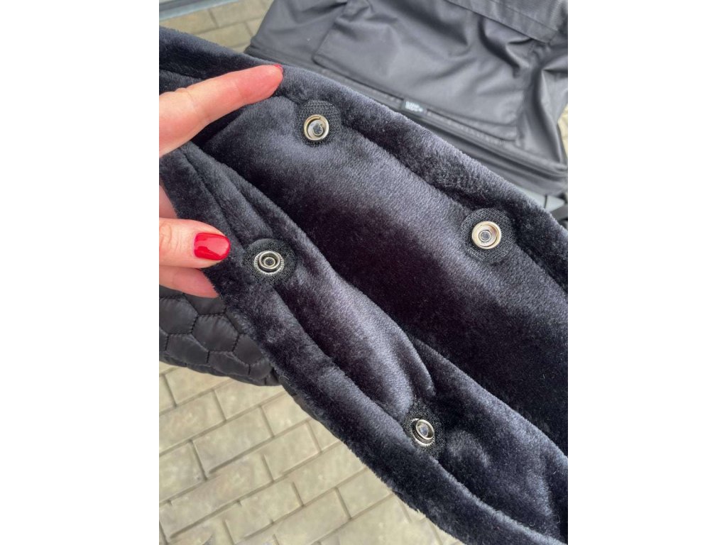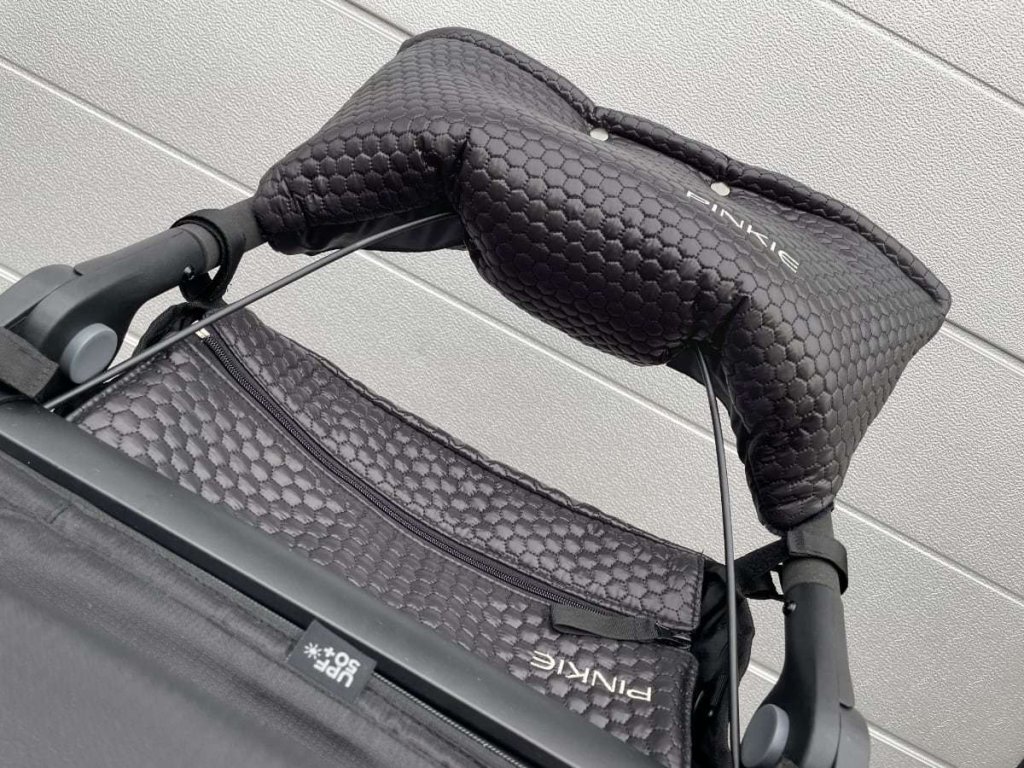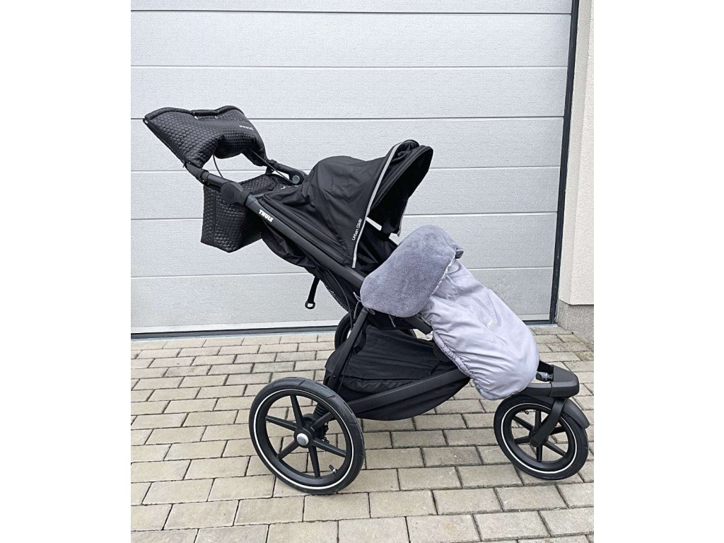 Rukávník vytvořený přímo na madlo Thule. Aby dobře seděl a nepřekážely mu lanka od brzdy, jsou vytvořené na rukávníku průstřihy, které se po připnutí na madlo zafixují suchým zipem. Rukávník je zcela uzavřen a s brzdou se dá dobře manipulovat.