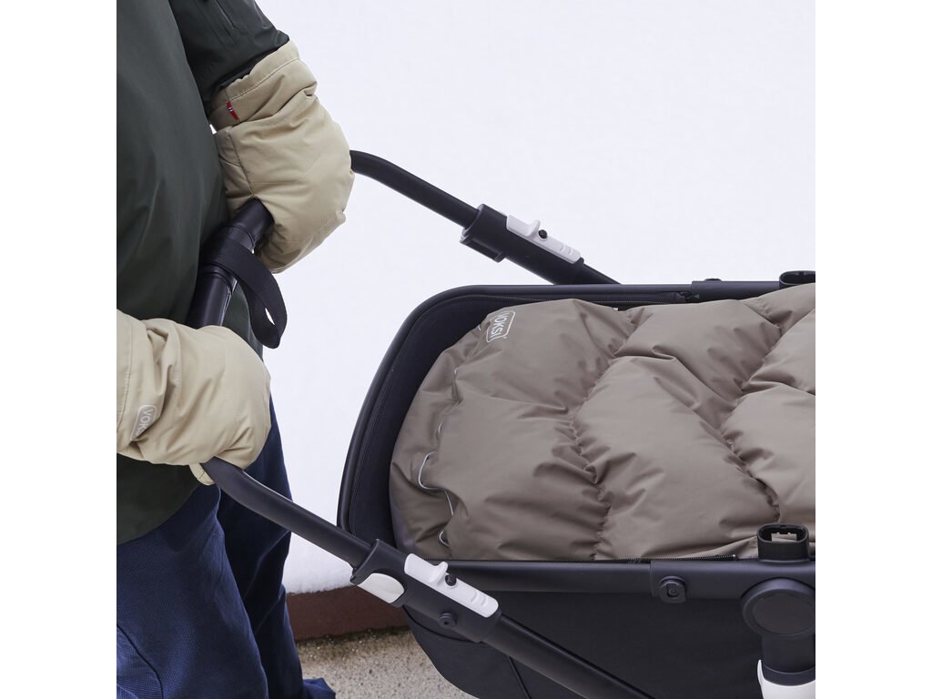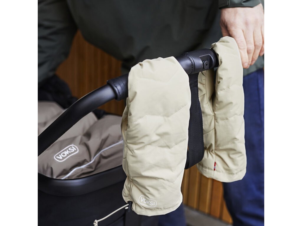 Rukavice jsou navržené tak, aby se vešly na všechny ruce i typy kočárků. Připevněte palčáky ke kočárku tak, že na špičce rukavice otevřete suchý zip a umístíte jej kolem rukojeti. Jednoduchou šňůrku na straně lze zatáhnout rukavice, aby obepnuly zápěstí a nedostala se do nich zima. Kombinujte a slaďte barvy rukavic s fusaky a dětskými botičkami Voksi.