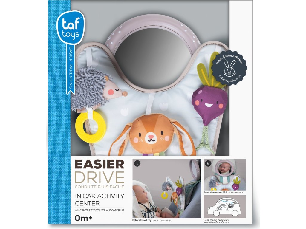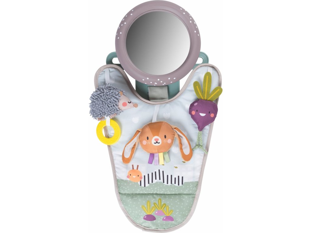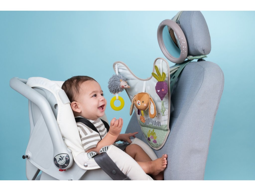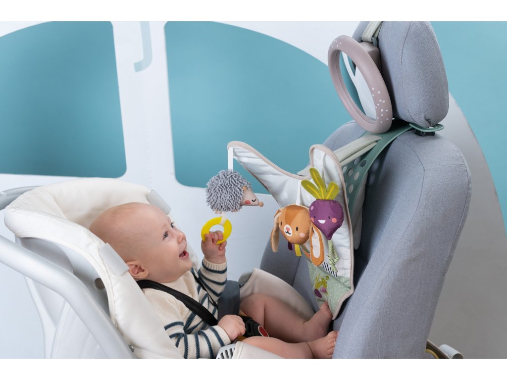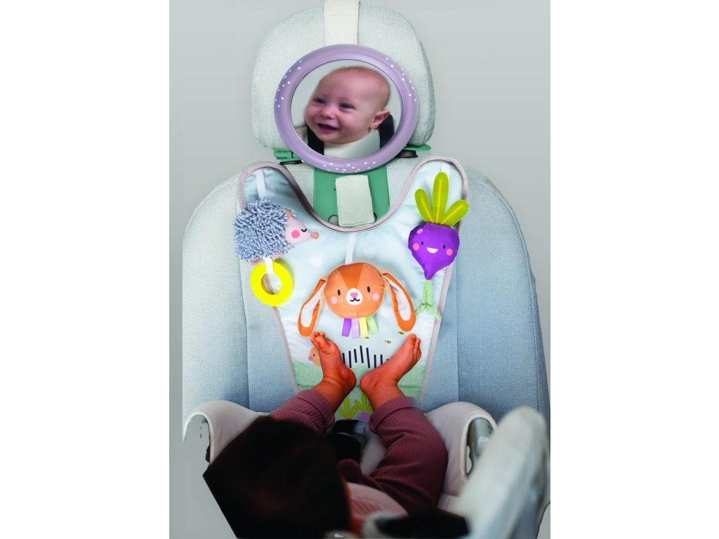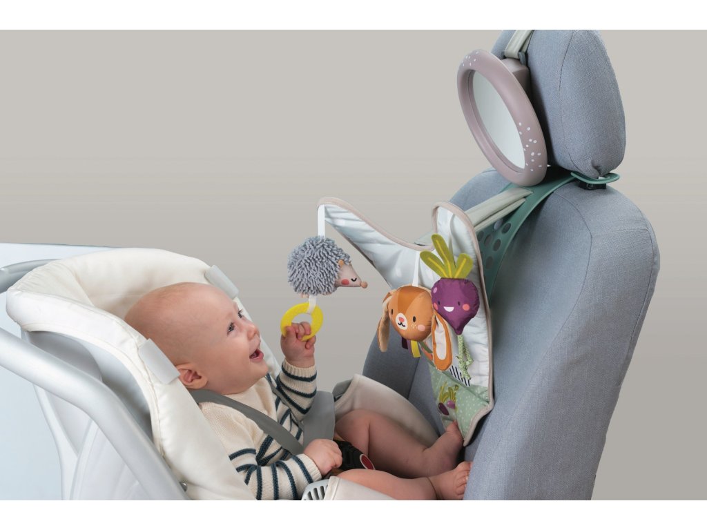Hrací pultík se zavěšenými textilními hračkami a krásnými ilustracemi ze života na zahradě zabaví během jízdy dítě sedící v autosedačce proti směru jízdy. Velké zpětné zrcátko umožňuje rodiči dítě sledovat během jízdy.