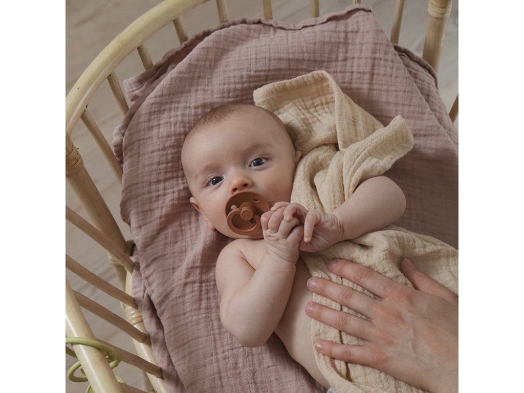 BIBS dobývajú celý svet. Jednoduché a štýlové. Ikonické cumlíky navrhnuté a vyrábané v Dánsku už od roku 1978. Ich minimalistický škandinávsky dizajn a široký farebný výber sú pre BIBS cumlíky typické. Všetky BIBS produkty sú garanciou najvyššej kvality detského sortimentu. Sacia časť je vyrobená zo 100%-ného prírodného kaučuku, ktorý je mimoriadne pružný a mäkký zároveň, odolný voči vytvoreniu trhlín a odštiepeniu malých kúskov. Cumlík je navrhnutý tak, aby nedráždil citlivú pokožku bábätka. Okrúhly krúžok s vetracími otvormi má klenutý tvar, takmer vôbec sa nedotýka pokožky okolo úst, tá preto zostáva kľudná, bez otlačkov a podráždení. Vďaka mäkučkému kaučuku a zabudovanému vzduchovému ventilu dieťa cumlík ľahko stláča a formuje v ústach, čím je zachovaný prirodzený vývin podnebia, ďasien a zúbkov detí. Prečo deti aj rodičia obľubujú cumlíky BIBS Colour? Extra ľahučký. Vďaka špeciálnemu klenutému tvaru krúžku je minimalizovaný dotyk cumlíka s pokožkou a nevznikajú otlačky a podráždenia. Guľatý / čerešničkový tvar sacej časti si často obľúbia aj deti, ktoré odmietajú iné tvary cumlíka. Dieťa saje len 100% prírodný bezpečný materiál – kaučuk vyrobený z miazgy stromu Hevea. Výnimočná chuť prírodného kaučuku, deti ho prirodzene uprednostňujú pred syntetickými materiálmi. Štýlový dizajn v mnohých farebných prevedeniach. Vyrobené v EU. Zloženie: Sacia časť: 100% prírodný kaučuk Ostatné časti: polypropylén (PP) potravinárskej kvality. Bez BPA, PVC, ftalátov a iných škodlivých látok. Vyrobené v Dánsku. Testované v Consumer Lab Denmark. V súlade s európskym štandardom EN 1400+A2. Veľkosti: BIBS Colour cumlíky sú k dispozícii v 3 veľkostiach. Veľkosť 1: 0-6 mesiacov Veľkosť 2: 6-18 mesiacov Veľkosť 3: od 18 mesiacov