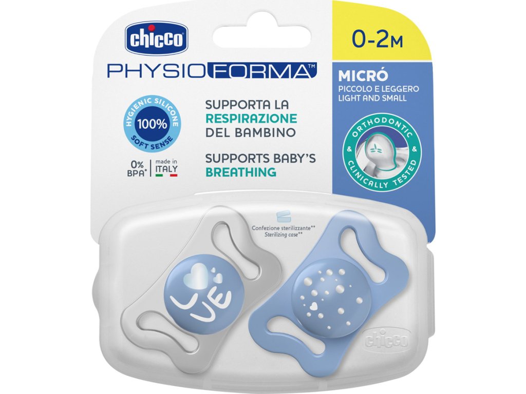Vyrobeno ze silikonu což je hygienický, praktický materiál, který se nedeformuje. Díky exkluzivní povrchové úpravě SOFT SENSE je měkký a sametový. Dudlík Chicco PhysioForma Micrò 0-2m díky svému exkluzivnímu tvaru podporuje správný vývoj úst a pomáhá umístit jazyk dopředu, čímž podporuje fyziologické dýchání.