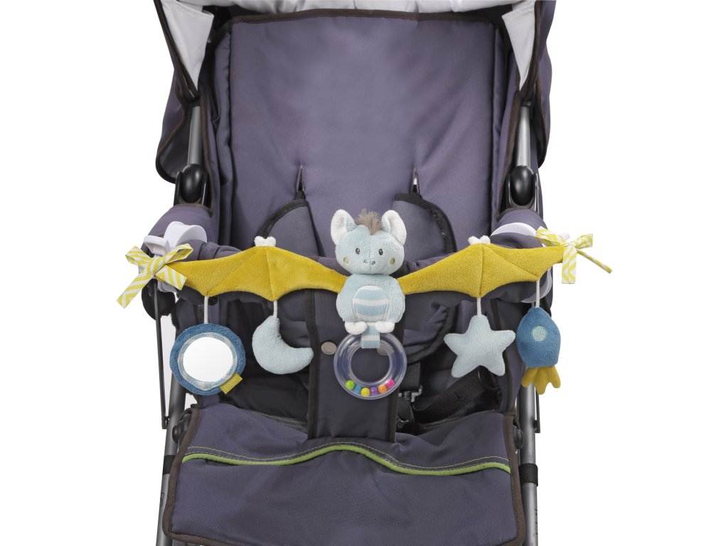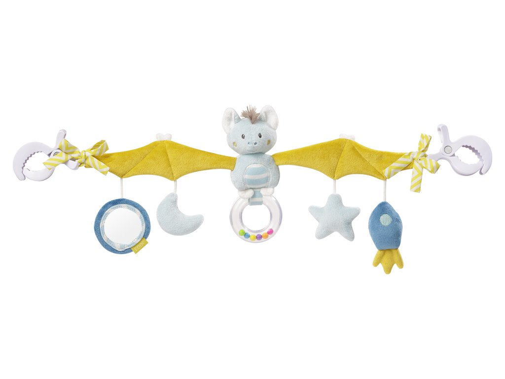Řetěz ve tvaru netopýra s roztaženými křídly. Na konci křídel jsou mašličky na ozdobu a pevné klipsy na připevnění. Uprostřed řetězu pod tělem netopýrka je chrastítko, které se dobře drží a obsahuje korálky v duhových barvách. Pod každým křídlem jsou závěsy, na kterých jsou upevněny hračky. Zrcátko, pískací hvězdička, rachotící raketka a půl měsíc vydávající šustivý zvuk. Řetěz je nápaditý a dokáže děti zabavit.