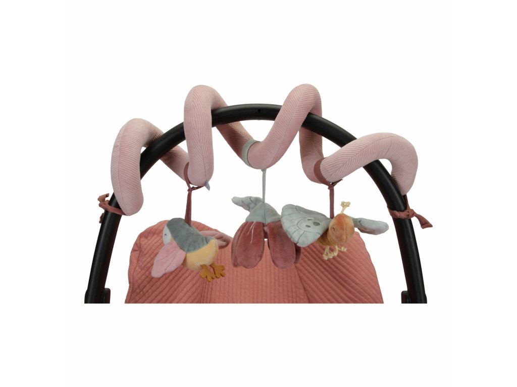 Tuto praktickou hračku snadno připevníte ke všemu od postýlky po ohrádku nebo autosedačku. Posiluje smysly a stimuluje koordinaci rukou a očí. Aktivní spirála je vyrobena z manšestru s bavlnou a otáčí se kolem malého ptáčka, barevného motýla a fascinující květiny, která vydává chrastivý zvuk.