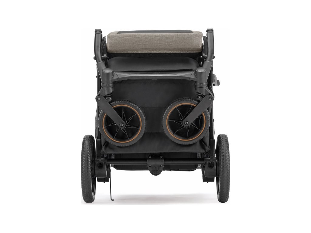 jsou speciální, nepromokavé a zvládají tak všechny povětrnostní podmínky. - Řízení kočárku je velmi pohodlné pomocí propojené rukojetí a také jej lehce zvládnete jen jednou rukou.