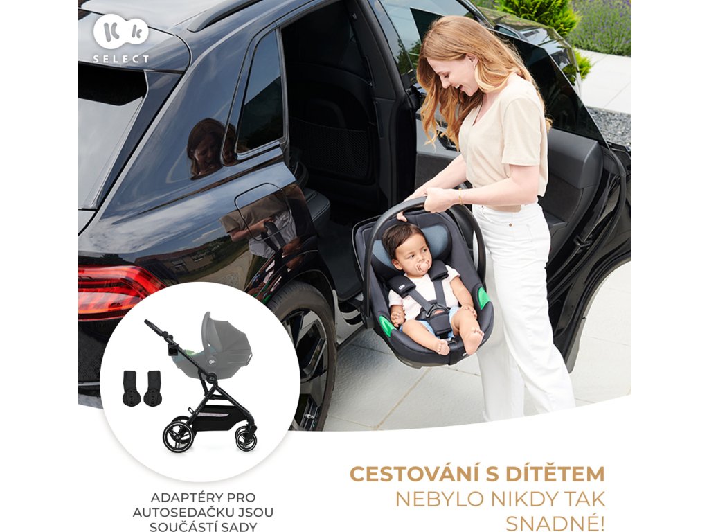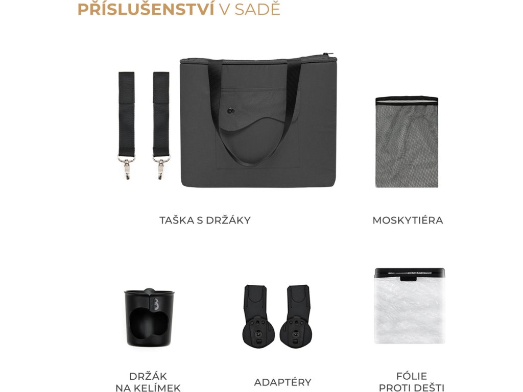 Ke kočárku patří také řada praktického příslušenství, jako je moskytiéra, pláštěnka, držák na nápoje, taška na rukojeť pro rodiče a adaptéry na autosedačku. Pokud již máte dětskou autosedačku, můžete z ní díky adaptérům vytvořit TRAVEL SYSTEM. A to vše v jednom kočárku!