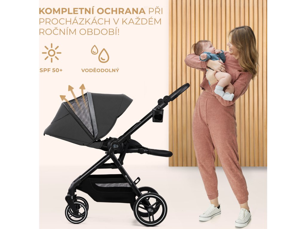 Stříška kočárku je velká a nepromokavá, s filtrem UPF50+. Má dodatečný ventilační panel a okénko pro kontakt s dítětem, přes které můžete sledovat, co vaše dítě dělá.