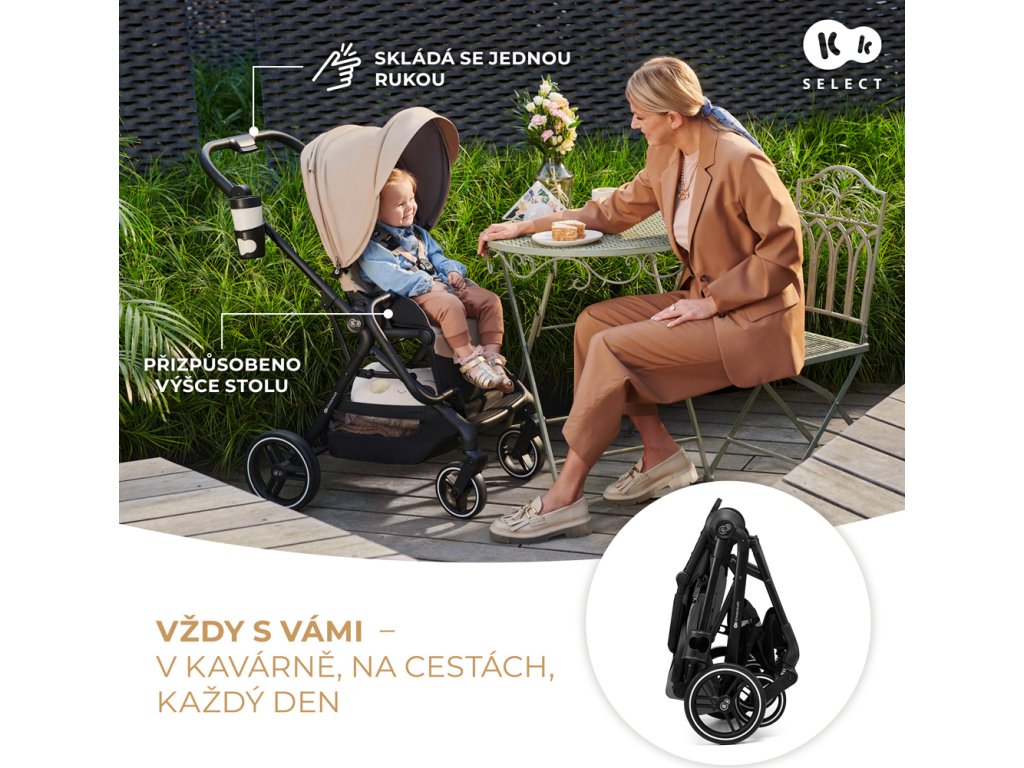 Sportovní kočárek YOXI má sedačku ve správné výšce, aby bylo možné kočárek snadno přistavit ke stolu, například při návštěvě kavárny nebo restaurace. Kočárek lze také snadno složit jednou rukou.