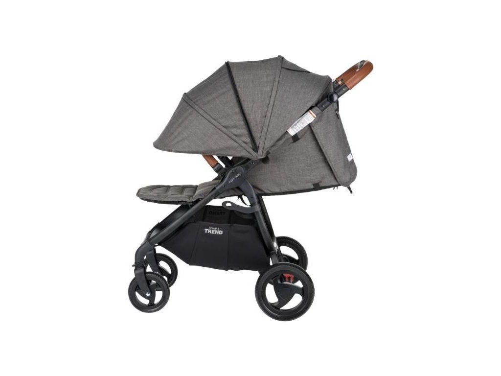 Novinkou kočárku Trend je polohovací rukojeť. Rukojeť i ochranné madlo jsou potažené ekologickou kůží, která kočárku propůjčuje luxusní vzhled. Ochranné madlo, které zároveň slouží jako pojistka před dítětem, lze otevírat z obou stran. Přední bezdušová kola s aretací, vhodná do každého terénu. Prostorný košík pro uložení nákupu ve spodní části kočárku. Maličkosti lze uschovat do drobné kapsičky na zadní straně kočárku, díky které se maminka vždy snadno dostane ke všem nezbytnostem. Kolébková brzda je nejen pohodlná na ovládání, ale poskytuje i potřebnou bezpečnost v případě zajištění kočárku.