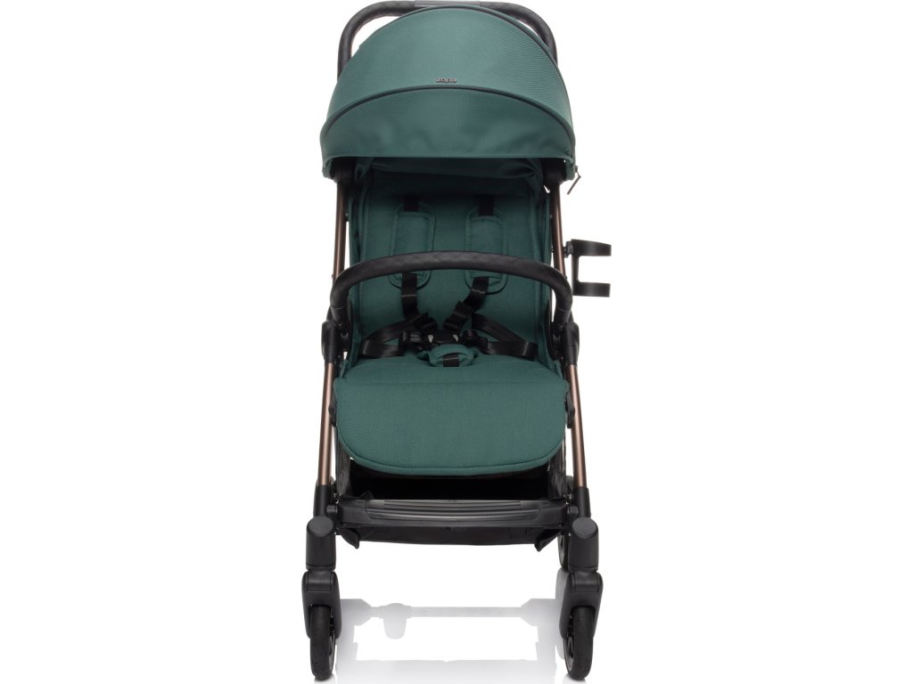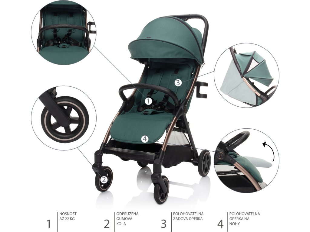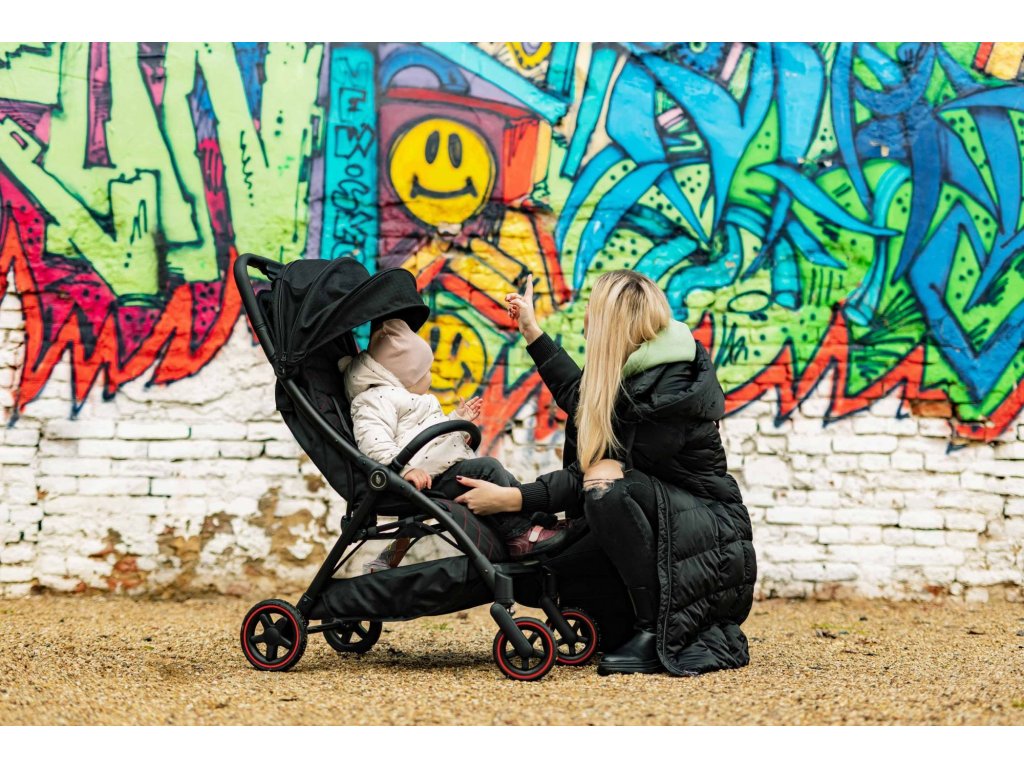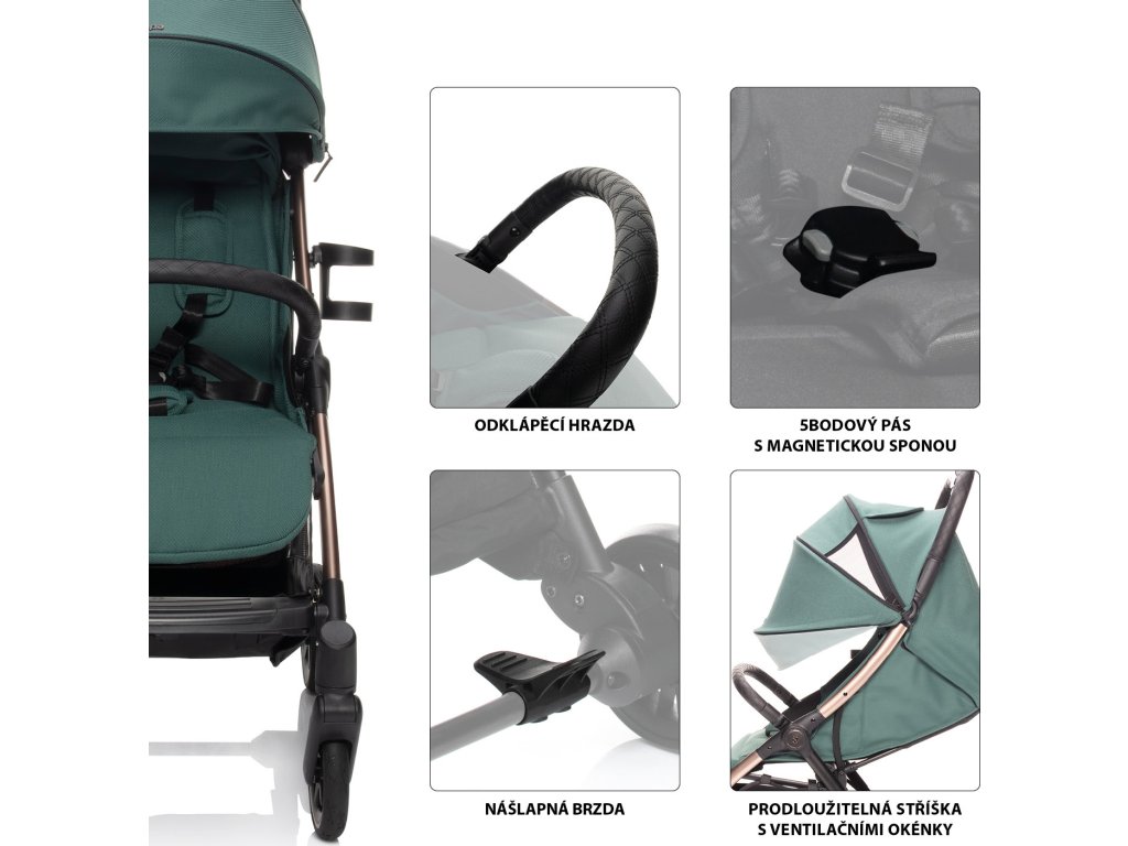 Měkké sportovní sezení je vybaveno 5bodovým bezpečnostním pásem s magnetickou sponou. Prošívanou hrazdu kočárku je možné odklopit pro snadnější usazení dítěte. Prodloužitelná stříška s ventilačními okýnky chrání dítě před sluncem i větrem. Součástí je košík, který unese až 3 kg věcí, které je dobré mít na cestách po ruce.