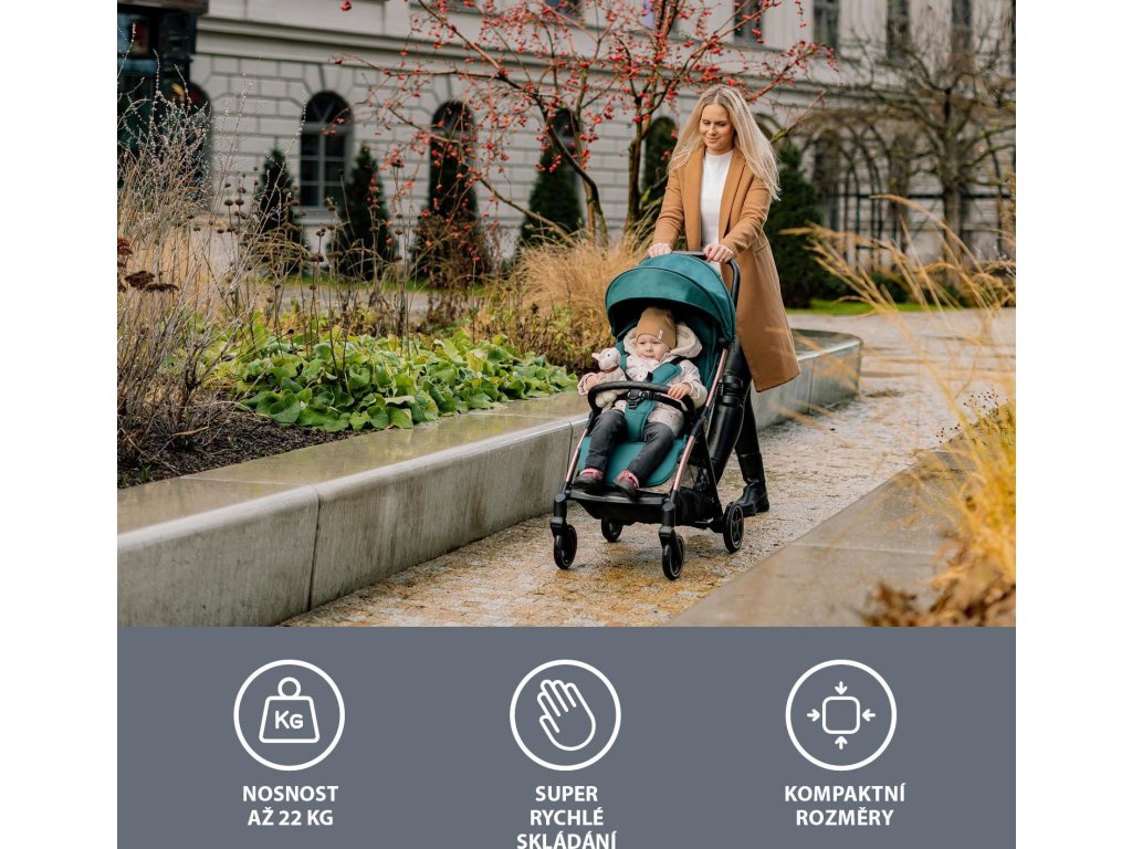 Lehký, zároveň pevný podvozek, malé rozměry a složení tak jednoduché, že ho zvládnete jednou rukou. Kočárek Quiq 2 si zamilují všichni rodiče, kteří jsou rádi na cestách a každou svou cestu si chtějí zpříjemnit. Gumová odpružená kola zvládnou dlažební kostky ve městě i nerovný terén při procházkách v přírodě. Díky kompaktním rozměrům zabere minimum místa a složený samostatně stojí. Prodloužená stříška s ventilačními okýnky zajistí spolehlivou ochranu před sluncem a větrání. Hrazdy jsou prošívané, což podtrhne jednoduchý design kočárku. Quiq 2 bude vozit svého malého cestovatele až do 22 kg.