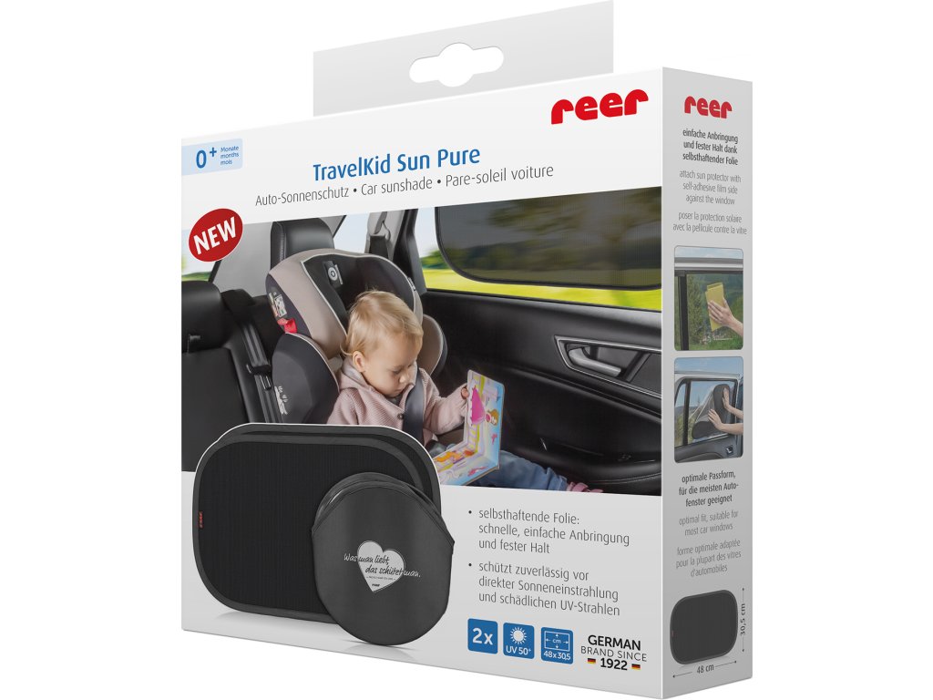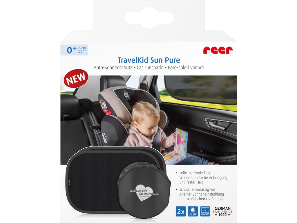 TravelKid Sun Pure poskytuje vašemu dítěti v autě příjemný stín a zabraňuje zahřívání vnitřku automobilu. Vysoce kvalitní látka má sluneční ochranný faktor 50+ a nabízí tak plnou ochranu před pronikajícími slunečními paprsky. Kromě obecné ochrany před slunečním zářením také odvádí nebezpečné UV záření a chrání tak vaše dítě před spálením.