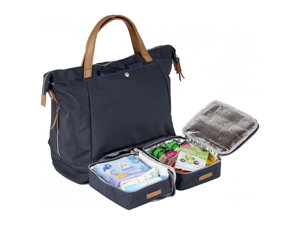 Standardní součástí tašky je také odnímatelný ramenní popruh, popruhy s klipy k upevnění na madlo kočárku, 2 obaly na lahev s pitím a 2 samostatné kapsy, které poslouží k uschování krému, jídla, vlhčených ubrousků atd. jedna z těchto přihrádek má termo úpravu, takže vaše jídlo zůstane déle teplé nebo chladné oproti ostatním kapsám v tašce. Tyto kapsy jsou chytře navrženy a uschovány ve spodní části tašky tak, aby nepřekážely při manipulaci s ostatními uloženými věcmi v hlavní části tašky.
