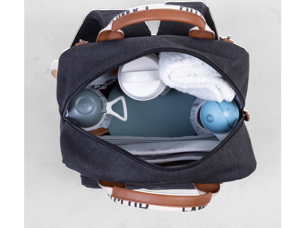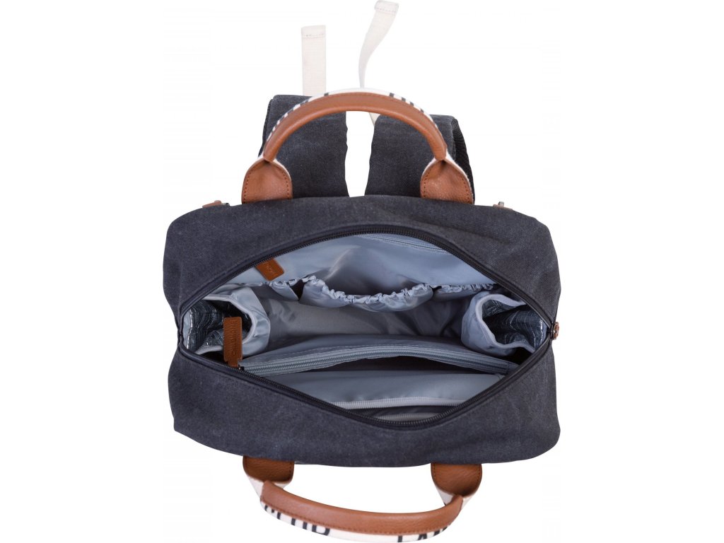 Součástí batohu je přebalovací podložka a termoizolační kapsy na láhev. Přehlednou organizaci obsahu batohu zaručuje množství vnitřních i vnějších kapes a úchytů. Díky speciální kapse pro vlhčené ubrousky jsou ubrousky vždy okamžitě po ruce připravené k použití. Úchyty na kočárek umožňují zavěšení batohu na rukojeť kočárku, úchyt na vytahovací rukojeť kufru vám usnadní cestování během dovolené.