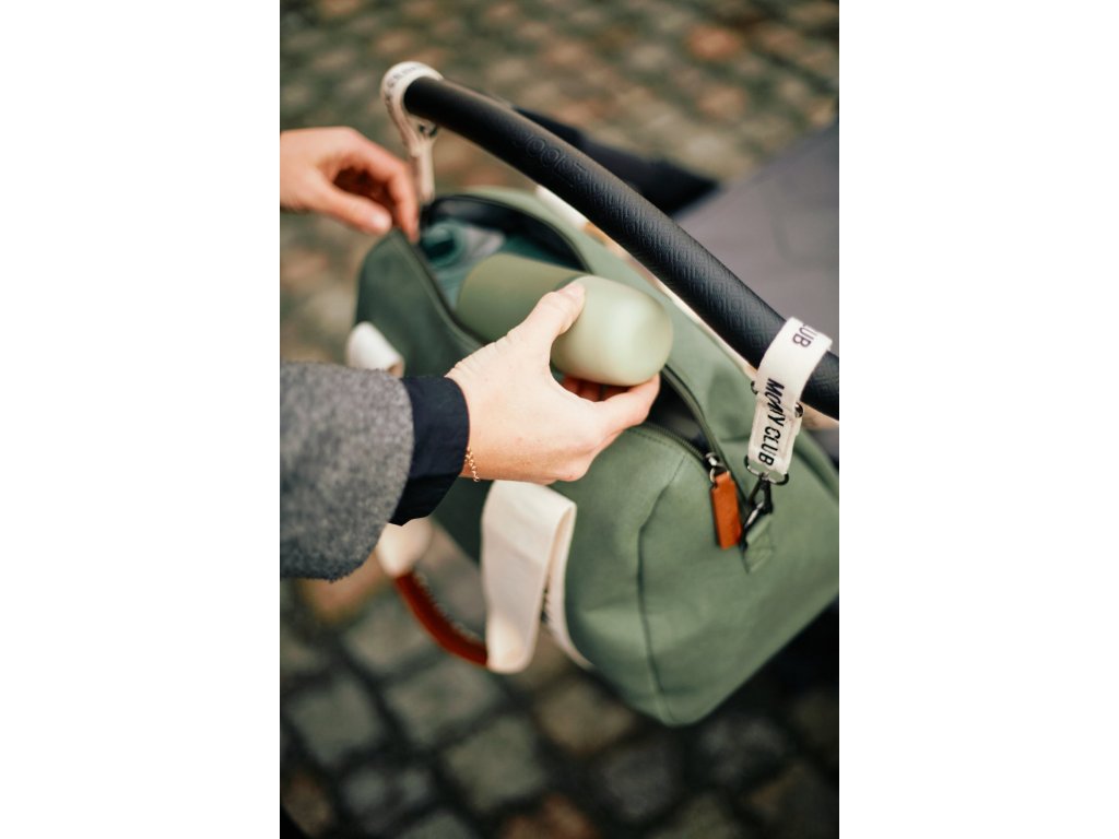 Přebalovací taška s uzavíráním na zip je vybavena držadly pro nošení v ruce, popruhem pro nošení přes rameno i úchyty pro zavěšení na kočárek.