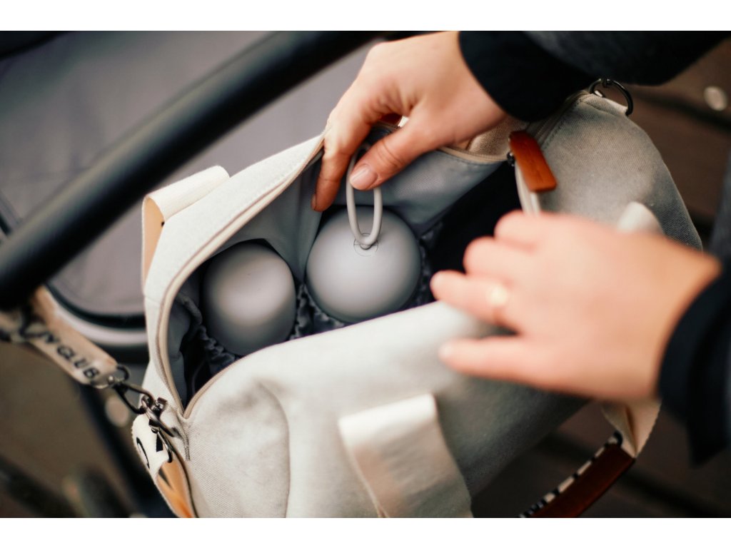 Přebalovací taška s uzavíráním na zip je vybavena držadly pro nošení v ruce, popruhem pro nošení přes rameno i úchyty pro zavěšení na kočárek.