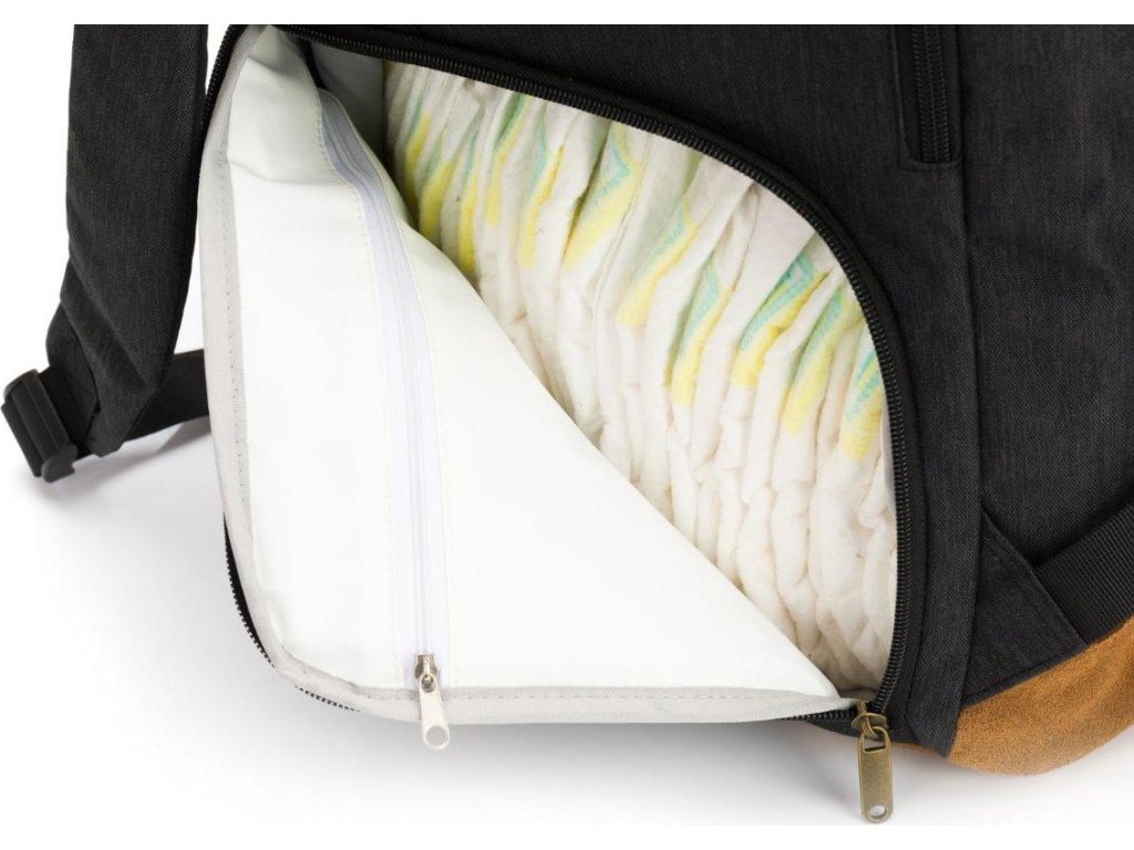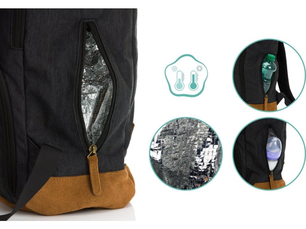 Přebalovací batoh Berlin je nejen krásný na pohled, ale také nesmírně praktický. Rolovací uzávěr umožňuje zvětšení objemu z 20 litrů na 22 litrů a při úplném otevření dokonce na 25 litrů. Díky praktickému magnetickému zapínání lze koženou přezku otevřít během několika sekund, navíc na zadní straně je další otvor pro rychlý a snadný přístup k věcem uloženým ve spodní části. Praktická přihrádka na přední straně nabízí prostor pro přiloženou přebalovací podložku a malá extra přihrádka na zadní straně nabízí bezpečný úložný prostor pro peněženku, klíče nebo jiné důležité předměty a spolehlivě je tak ochrání před zloději. Po stranách jsou dvě praktické přihrádky, do kterých se vejdou láhve o objemu až 0,5 litru. Další předností je, že jedna z nich je podšitá termomateriálem, což znamená, že kojenecká láhev může být déle teplá nebo že nápoj maminky či tatínka vydrží déle chladný při pozdějším použití.