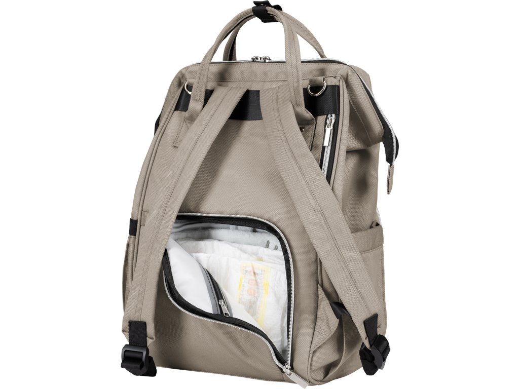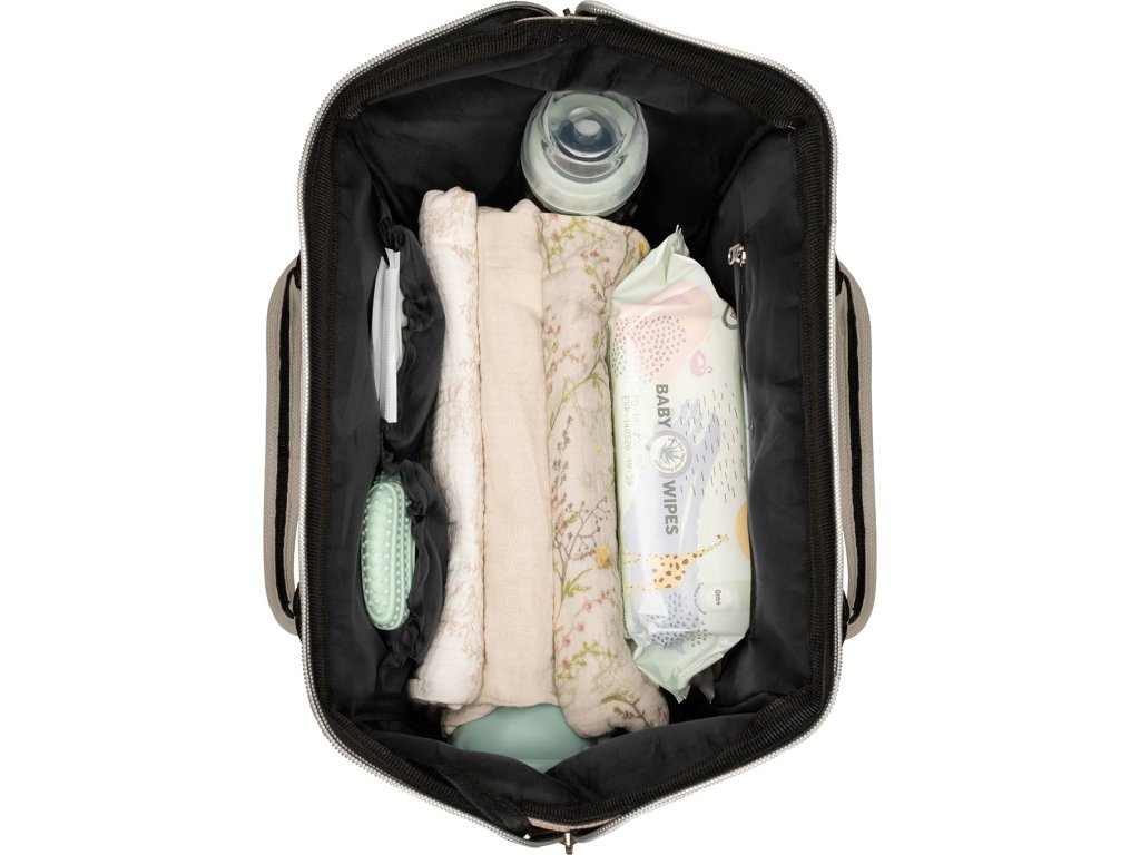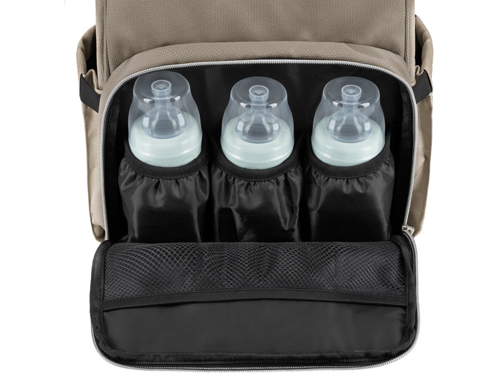 Uvnitř batohu najdete množství kapes a přihrádek i voděodolnou kapsu pro uložení vlhkých předmětů. Široký způsob otevírání batohu usnadňuje orientaci v uloženém obsahu. Na vnější straně najdete kapsy s uzavíráním na zip i kapsu pro uložení láhve. Termoizolační kapsy na láhve pomáhají udržet nápoje či mléko delší dobu v optimální teplotě. Součástí batohu je i přebalovací podložka.
