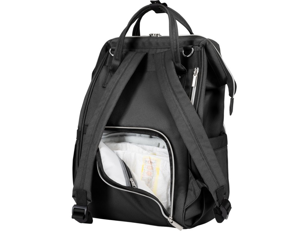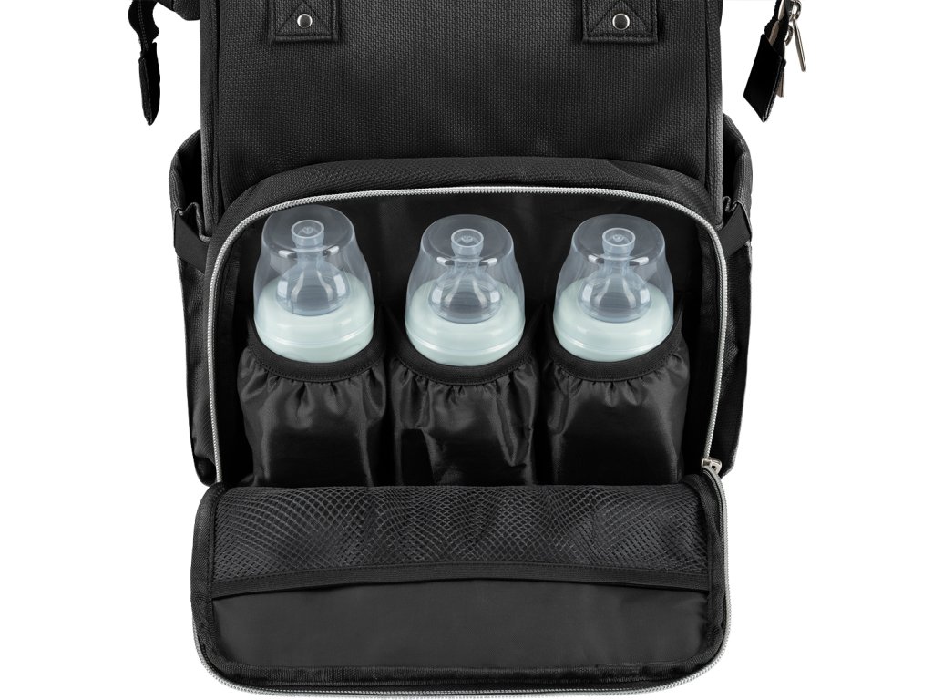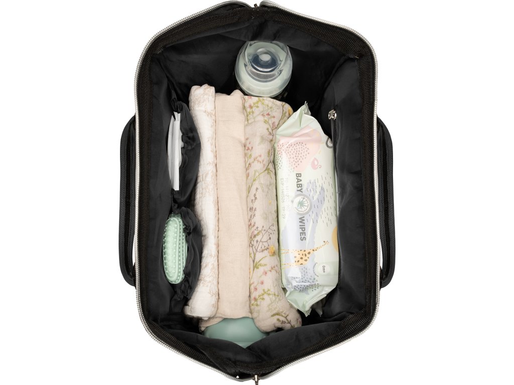 Uvnitř batohu najdete množství kapes a přihrádek i voděodolnou kapsu pro uložení vlhkých předmětů. Široký způsob otevírání batohu usnadňuje orientaci v uloženém obsahu. Na vnější straně najdete kapsy s uzavíráním na zip i kapsu pro uložení láhve. Termoizolační kapsy na láhve pomáhají udržet nápoje či mléko delší dobu v optimální teplotě. Součástí batohu je i přebalovací podložka.