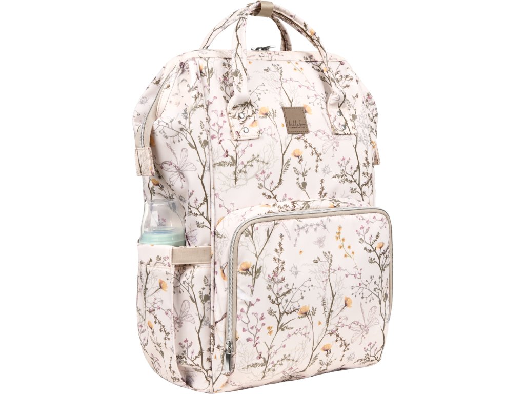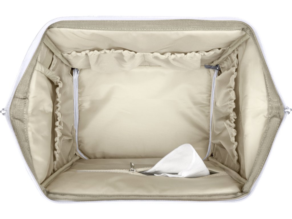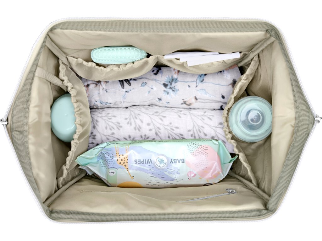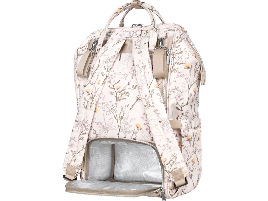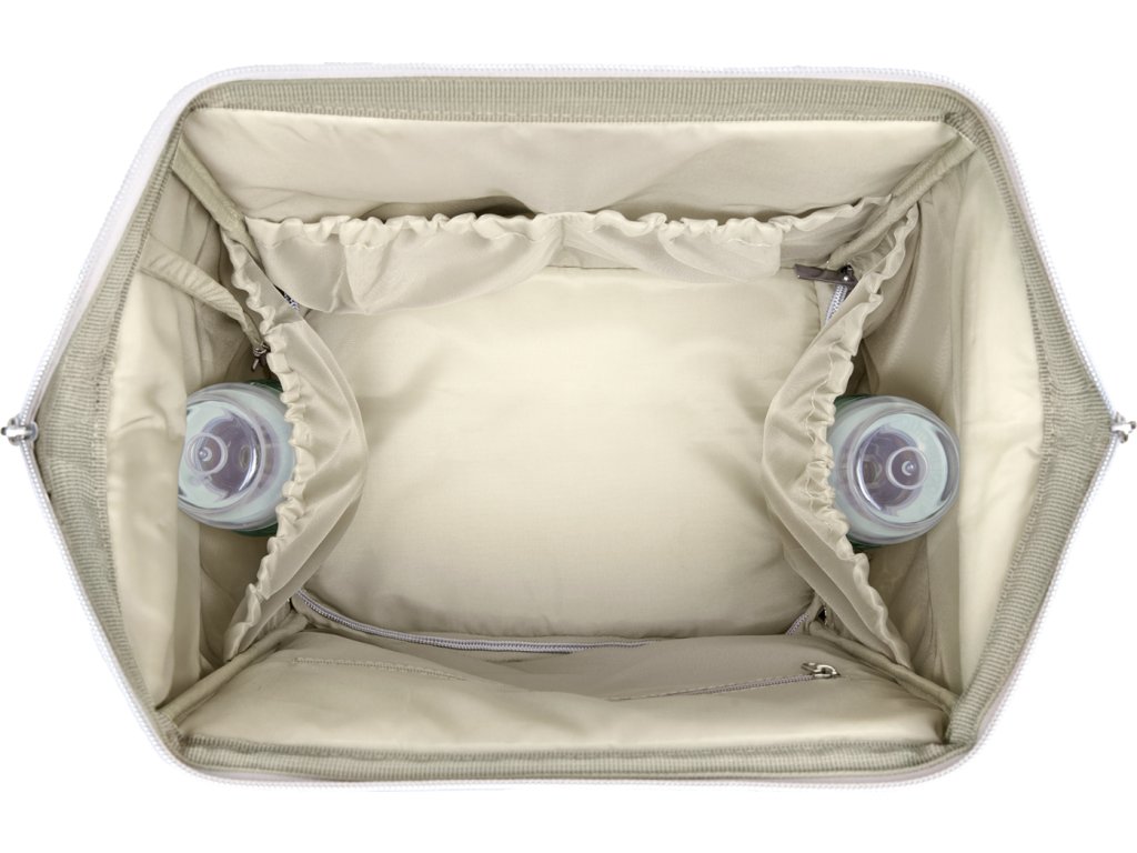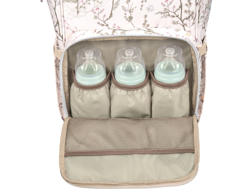 Uvnitř batohu najdete množství kapes a přihrádek i voděodolnou kapsu pro uložení vlhkých předmětů. Široký způsob otevírání batohu usnadňuje orientaci v uloženém obsahu. Na vnější straně najdete kapsy s uzavíráním na zip i kapsu pro uložení láhve. Termoizolační kapsy na láhve pomáhají udržet nápoje či mléko delší dobu v optimální teplotě. Součástí batohu je i přebalovací podložka.