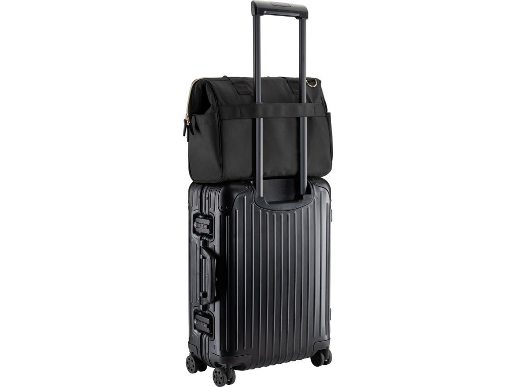 Držadla umožňují pohodlné nošení v ruce, součástí tašky je i ramenní popruh pro nošení přes rameno. Úchyty na zadní straně umožňují připevnění k rukojeti kufru.